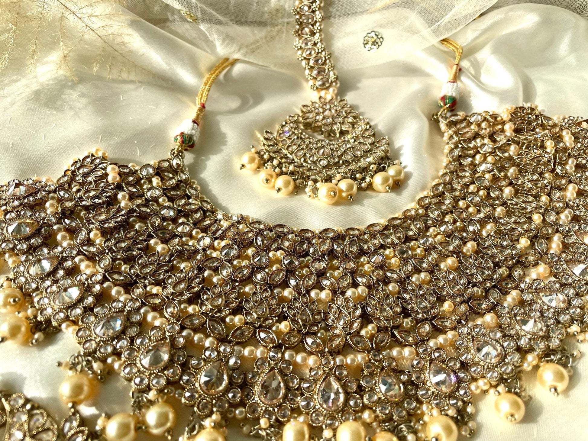 Our Bridal Choker Necklace, an enduring piece that exudes grace and luxury, will enhance your bridal elegance. It is embellished with sparkling Polki stones. The ideal choice for a bride looking to add a touch of tradition and luxury to her wedding day.