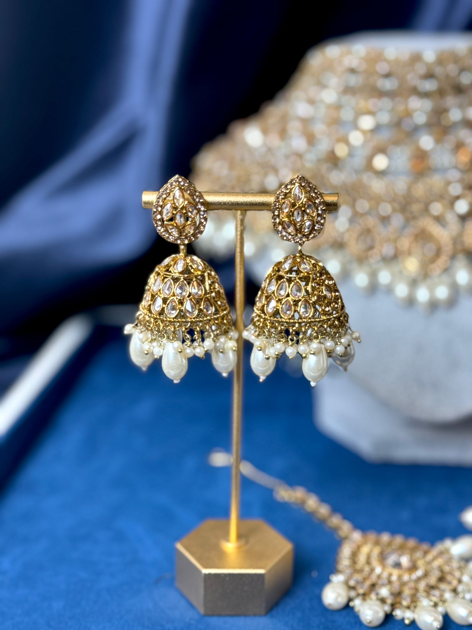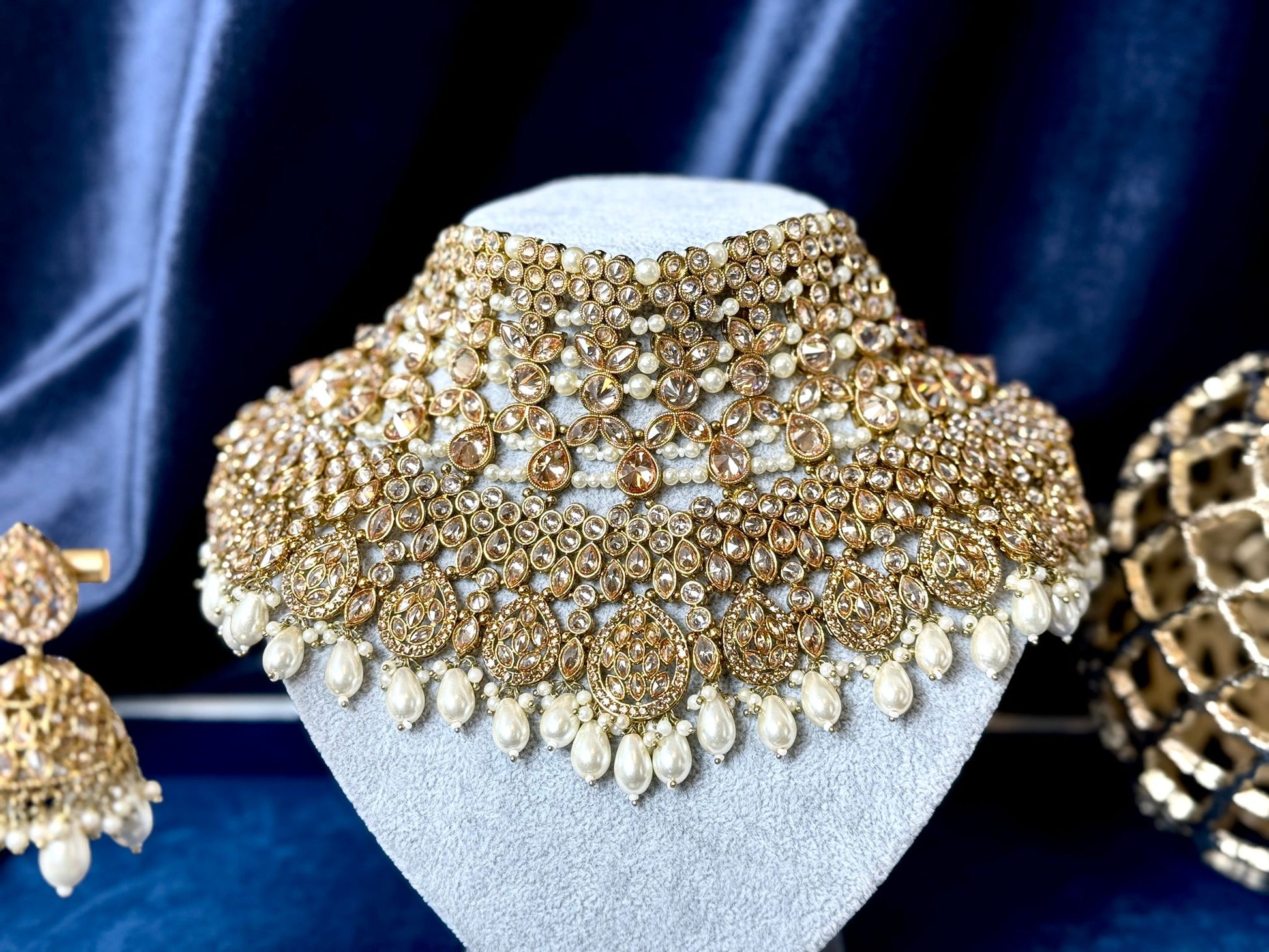 Elevate your bridal elegance with our exquisite Bridal Gold Statement Set. Luxurious Gold Bridal set made up of of golden crystals and thousands of tiny pearls . Make a statement on your special day with this resplendent gold jewelry set.