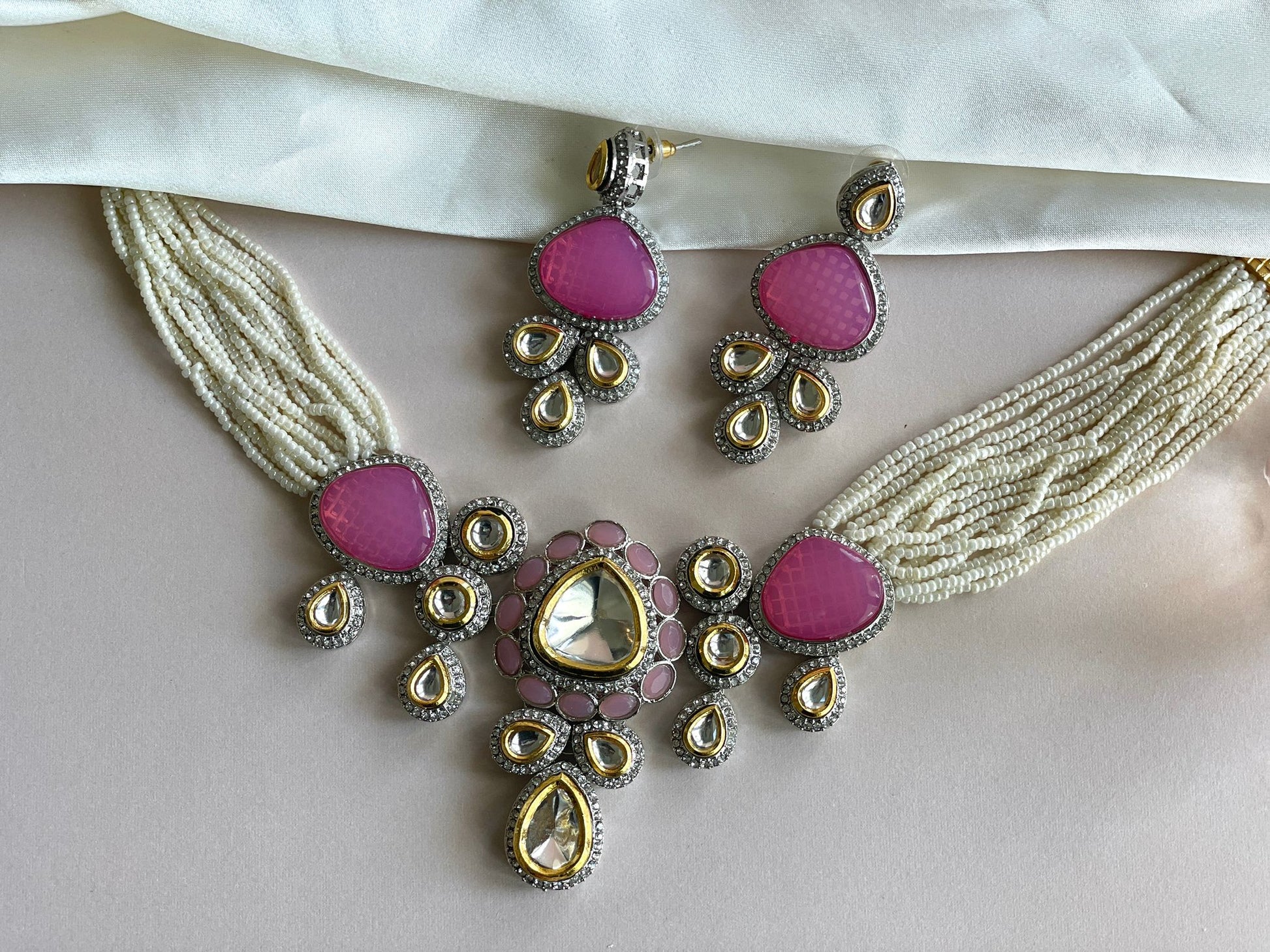 With this Bright Pink Statement Choker, you can make a strong statement. This kundan choker is vibrant and adventurous, with eye-catching, glossy pink beads that demand attention. It gives every ensemble a little drama and flair.