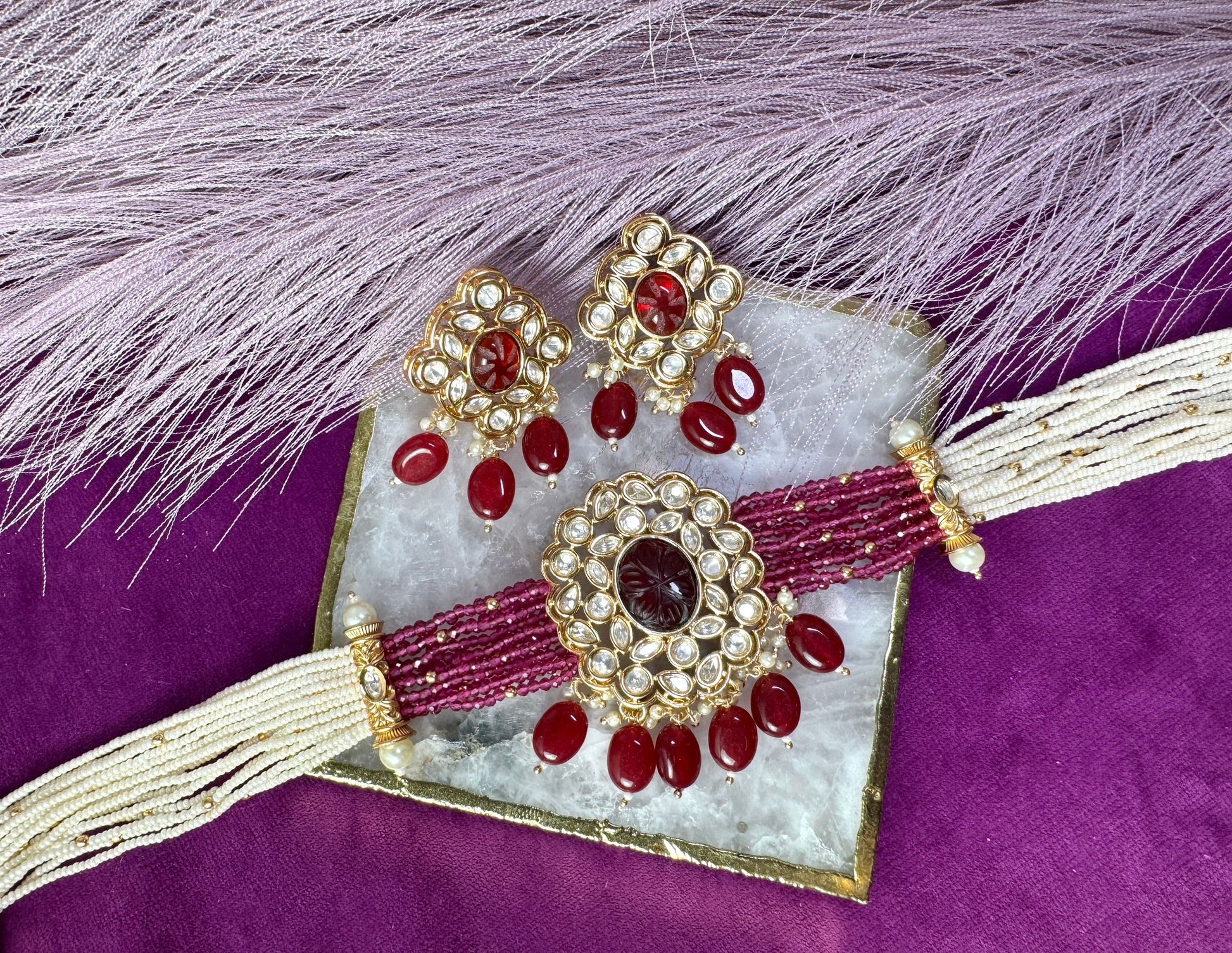 Elevate your self with our burgundy tyaani choker set with matching earrings. Crafted for timeless beauty, it's the perfect statement piece for any occasion.