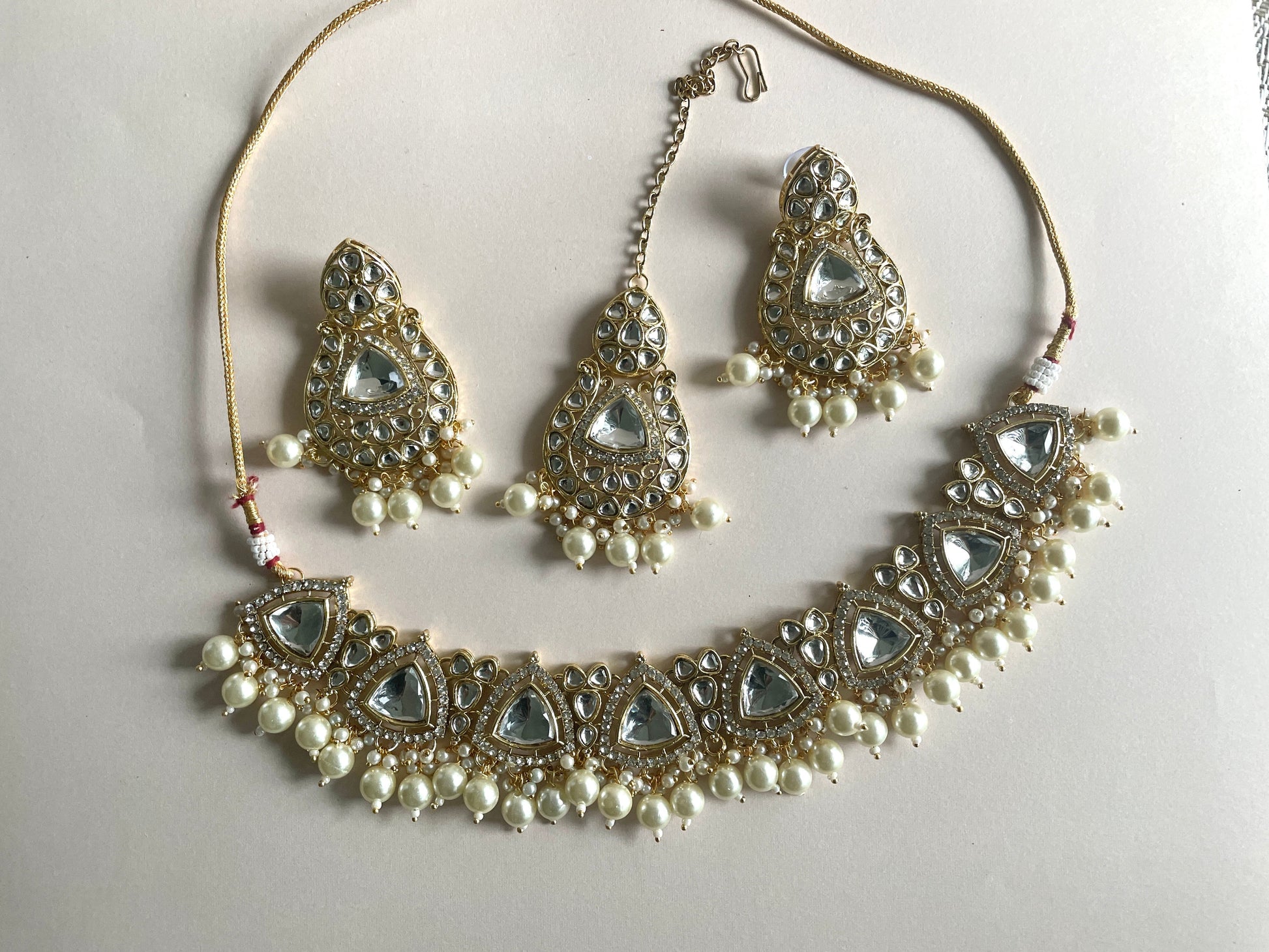 Pretty gold plated kundan necklace set with matching earrings and tikka. This set may look heavy but is super light weight to wear. This set is so luxurious to wear to any Indian occasion. It is high quality with gold kundan and pearls.