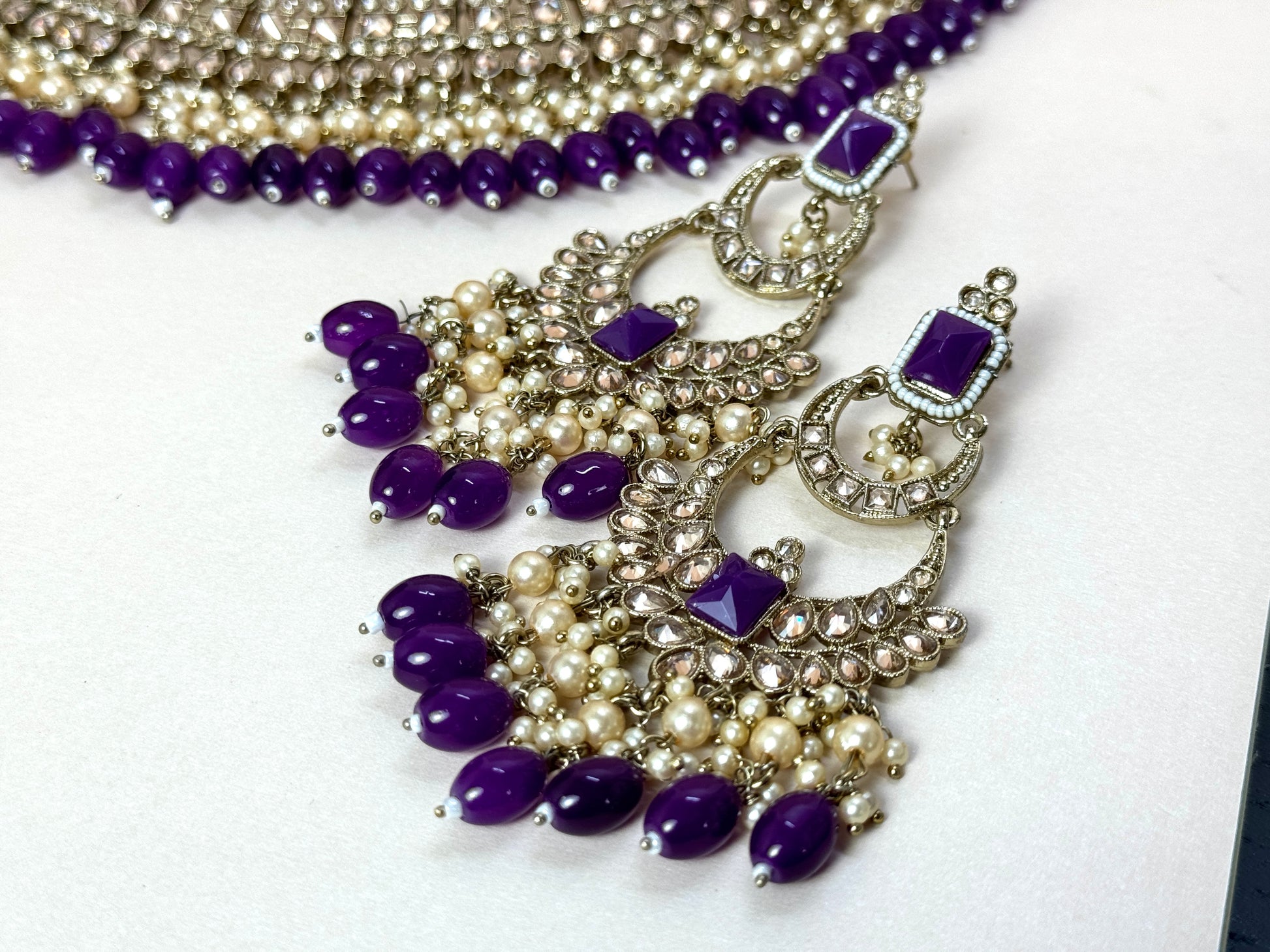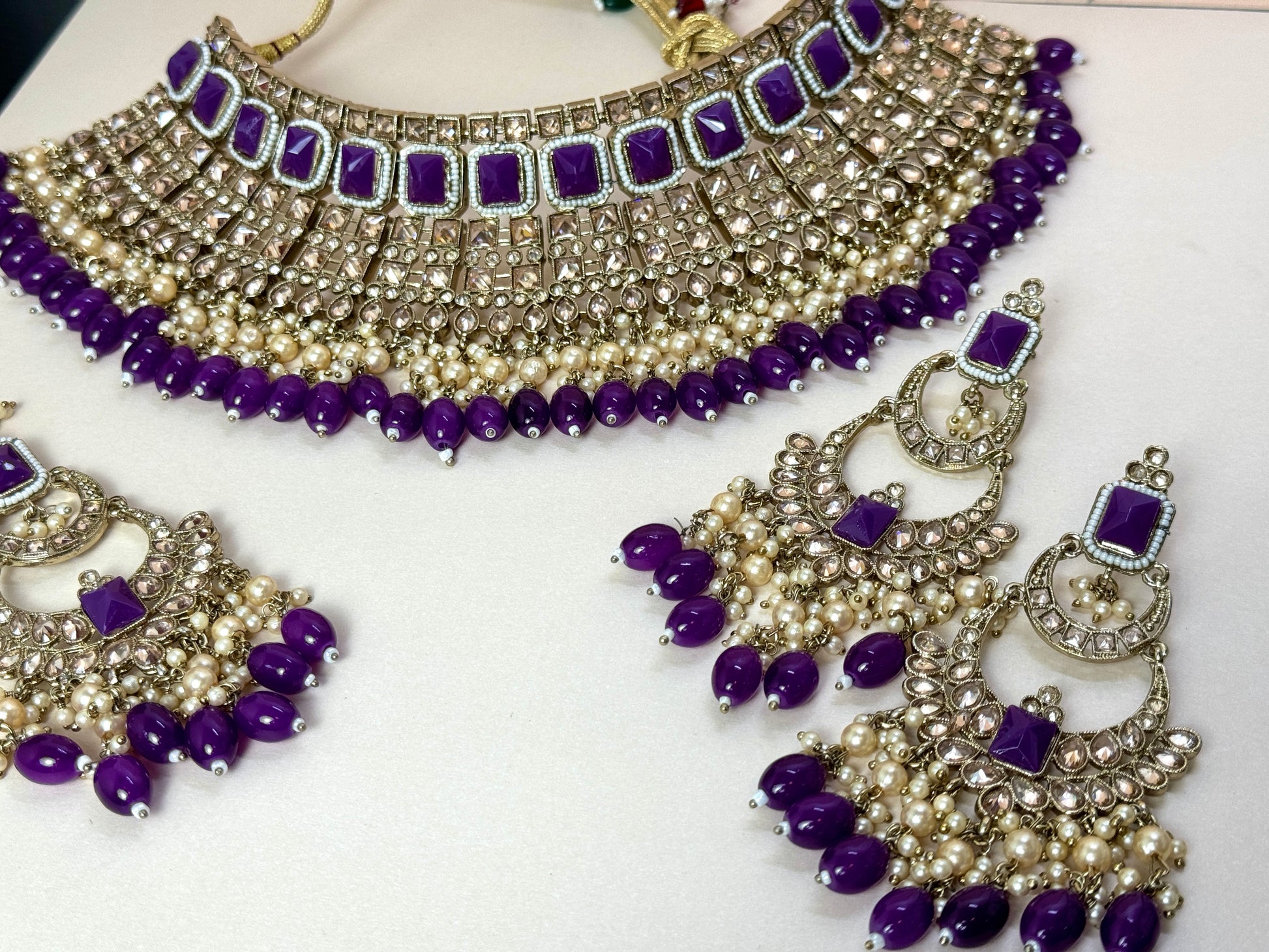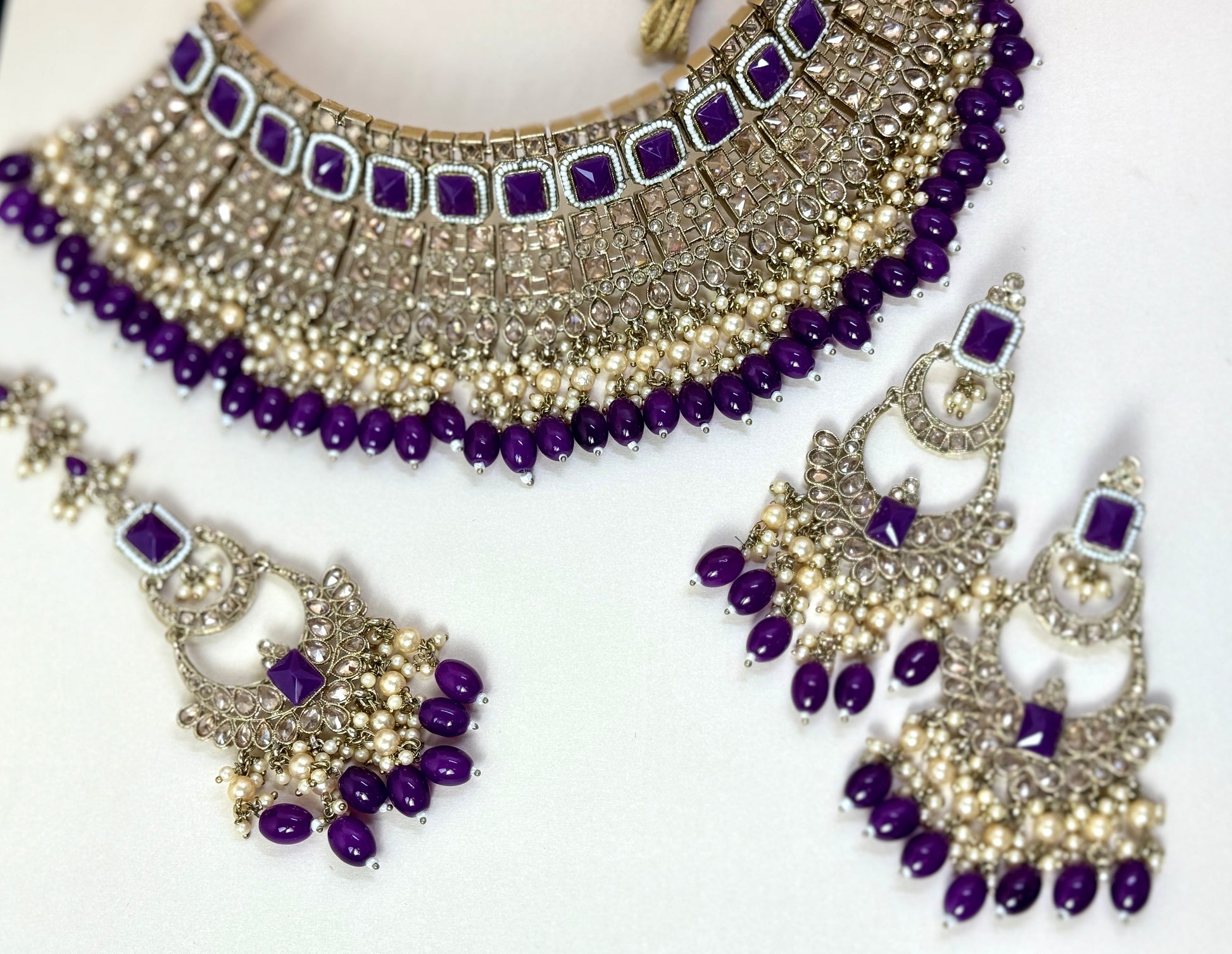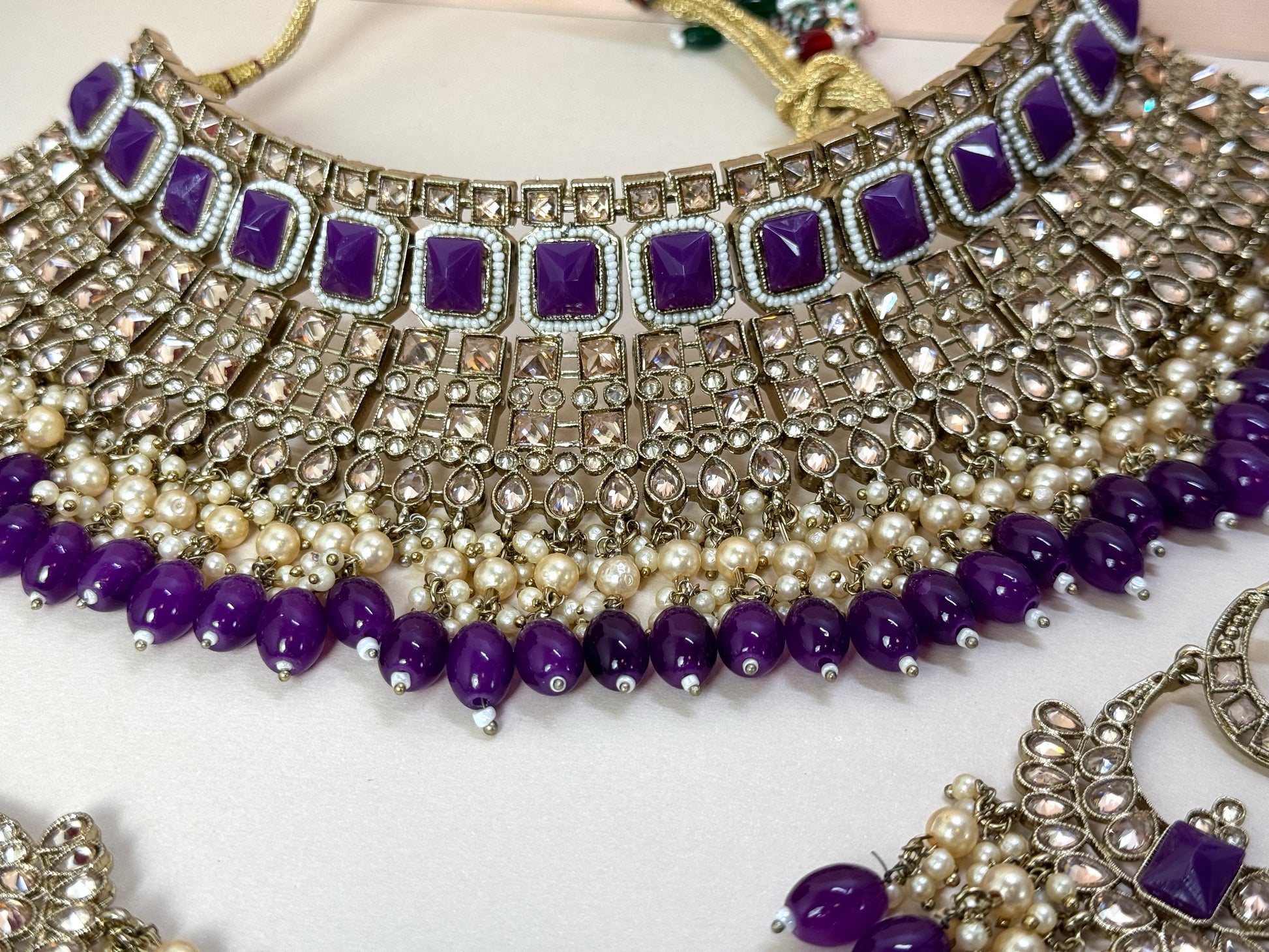 Dark purple and gold bridal set with earrings and tikka