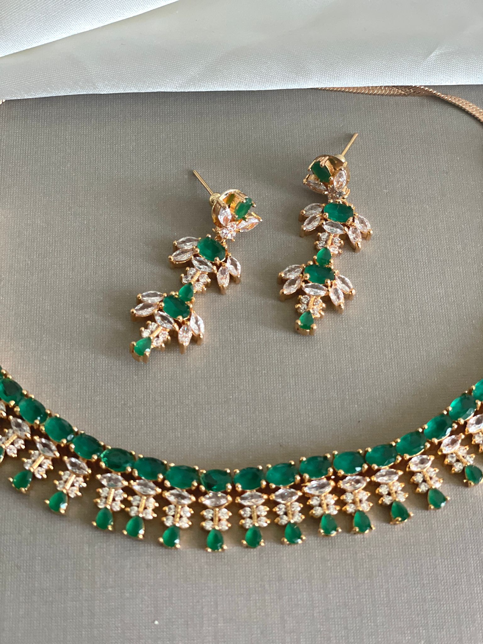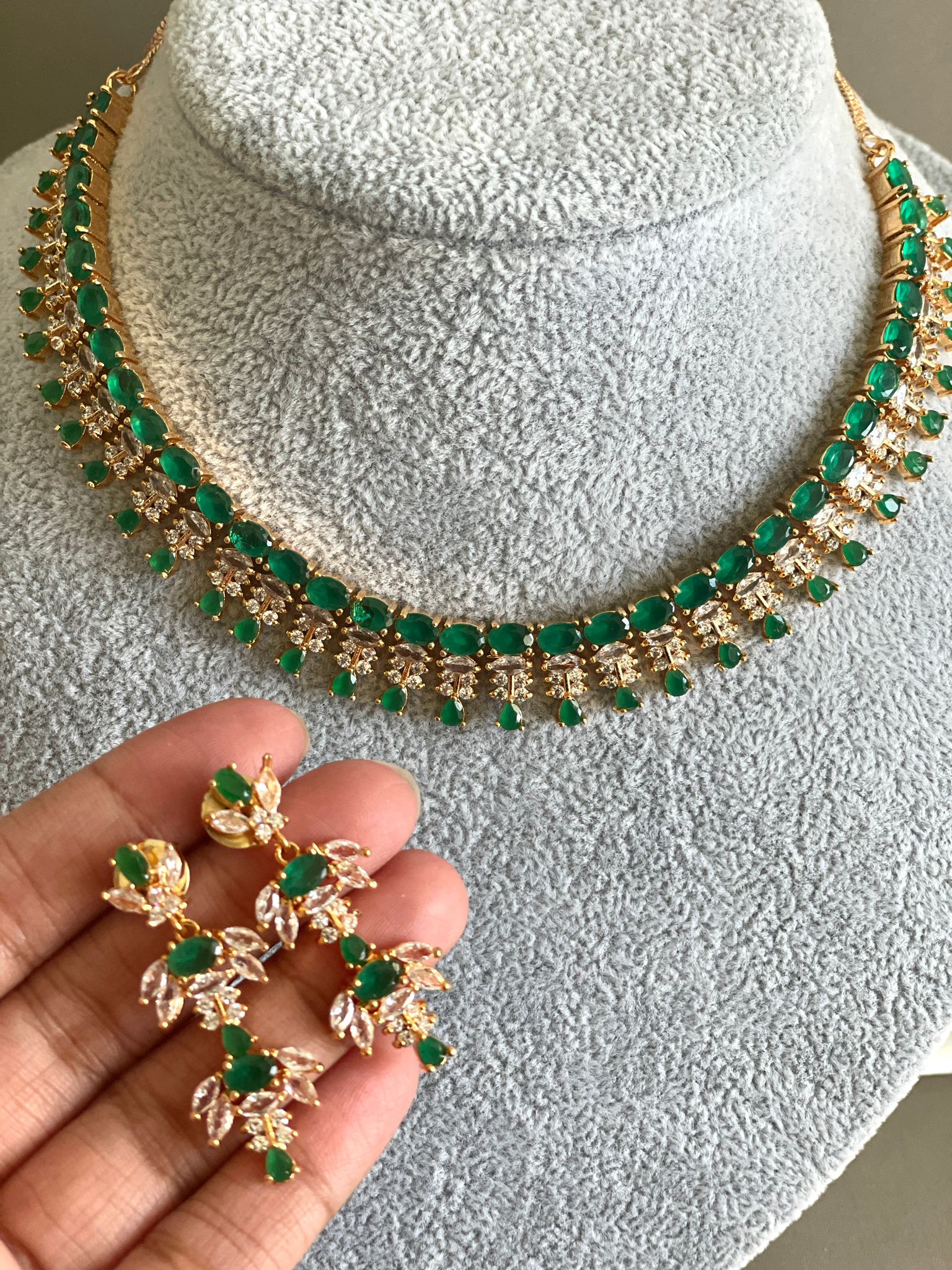 Introducing the exquisite Emerald Green AD Necklace – a masterpiece that encapsulates elegance and sophistication in every facet. Crafted to mesmerize and captivate, this stunning necklace is a testament to the timeless beauty of emerald green gemstones.