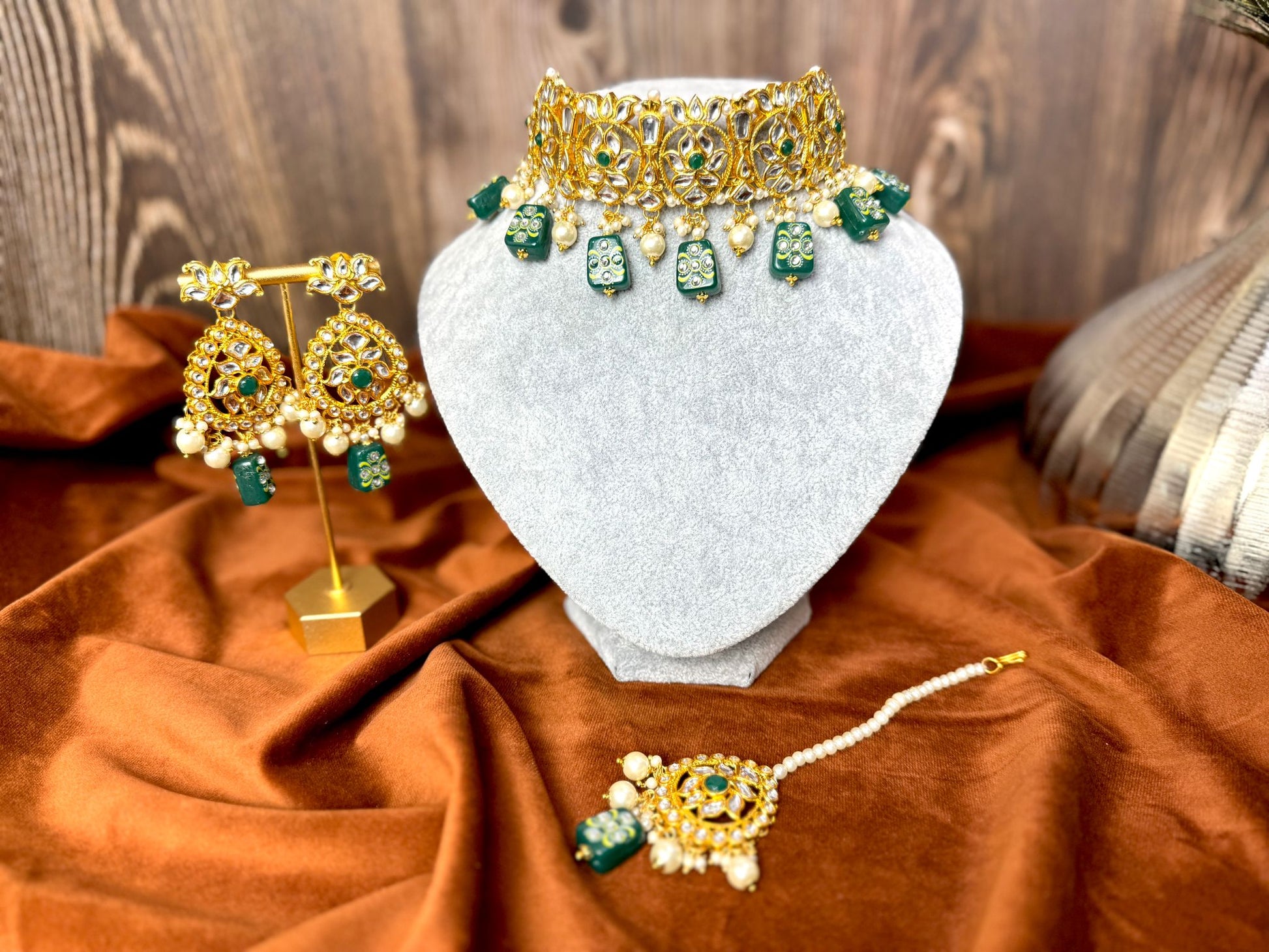 With its delicate blend of traditional workmanship and modern elegance, this gorgeous emerald green Meenakari Set will elevate your look and offer a touch of refinement to any occasion.