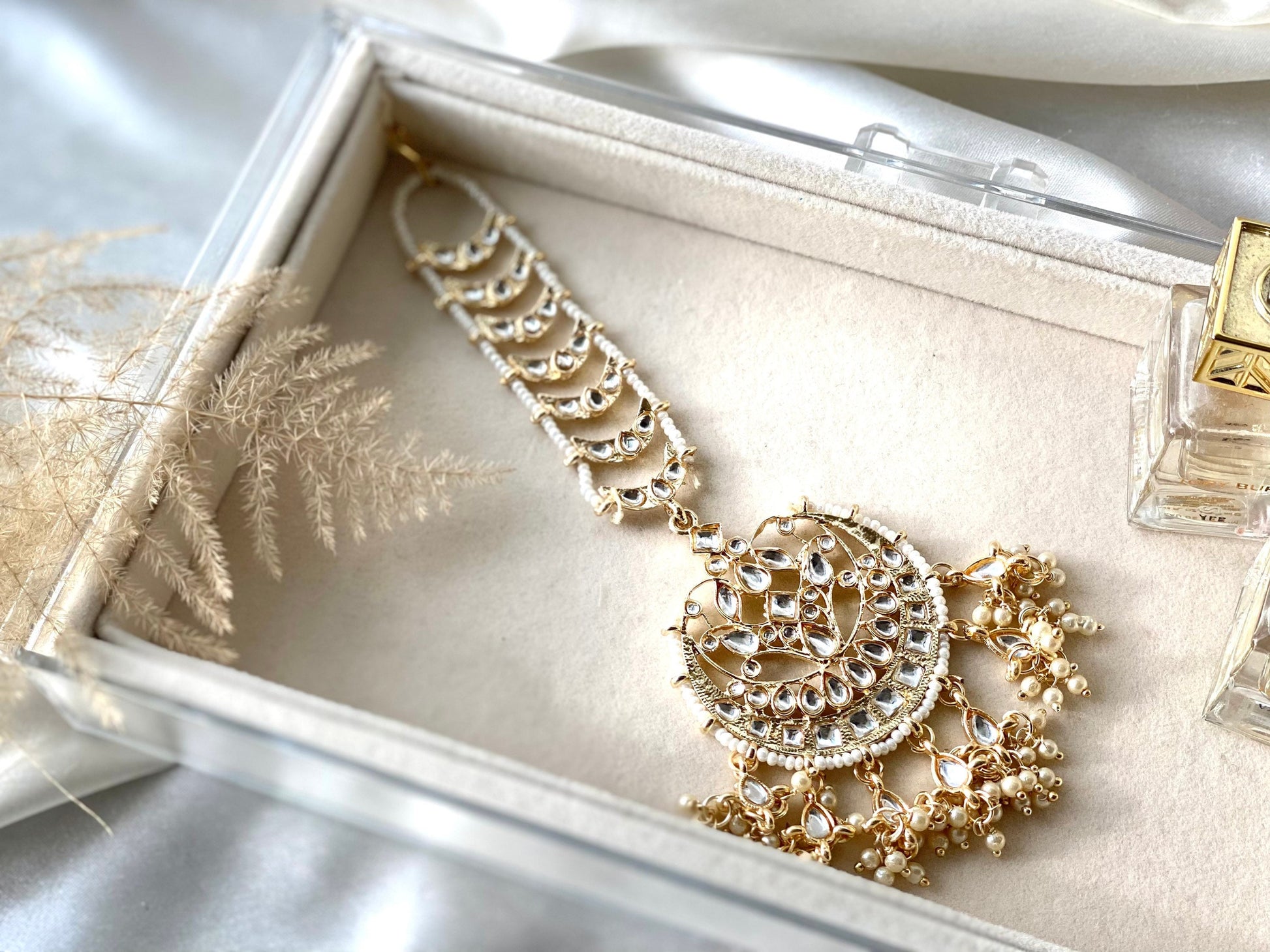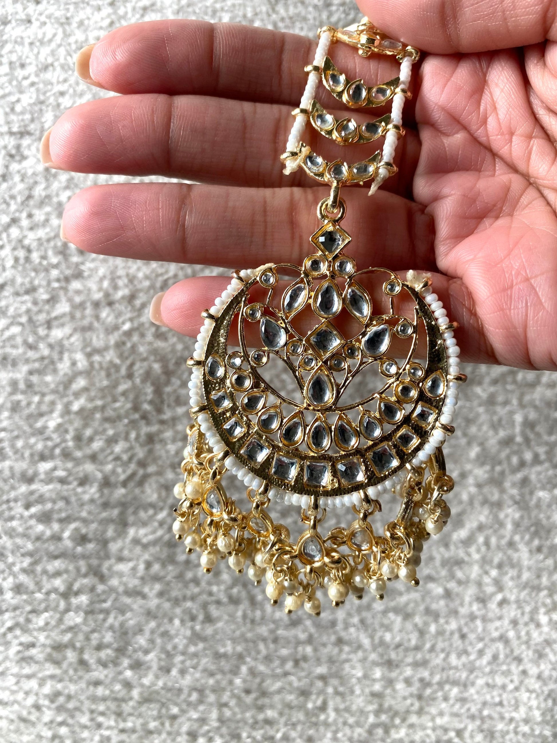 Gold kundan tikka, a work of art that embodies both grace and artistry. For any memorable event or celebration, this exquisite headpiece will bring a touch of tradition and grace to your outfit.