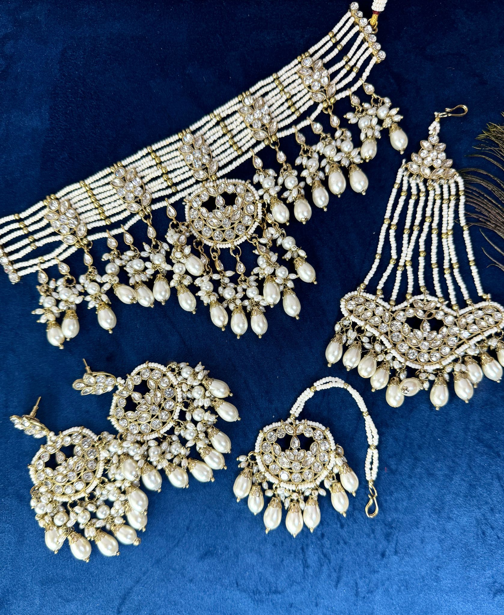 Elevate your bridal elegance with our Gold Pearl Bridal Set, a timeless ensemble that exudes sophistication. Make a statement on your special day with this exquisite and gracefully crafted bridal accessory.