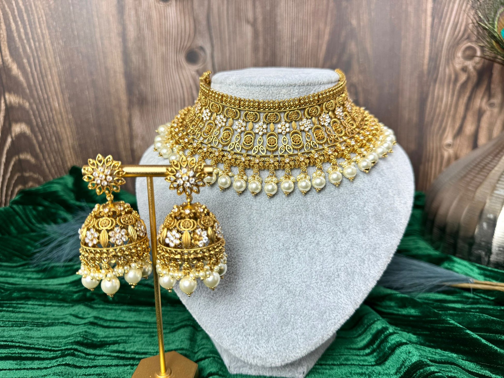 This gorgeous gold-plated wedding set will elevate your bridal elegance. It has stunning features and beautiful craftsmanship that will look amazing on your special day.