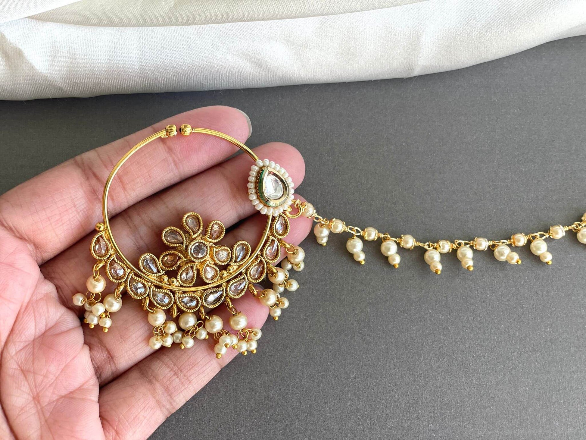 The Golden Bridal Nose Ring is a magnificent piece of jewellery that enhances a bride's beauty on her big day by adding a touch of tradition and elegance to her outfit.