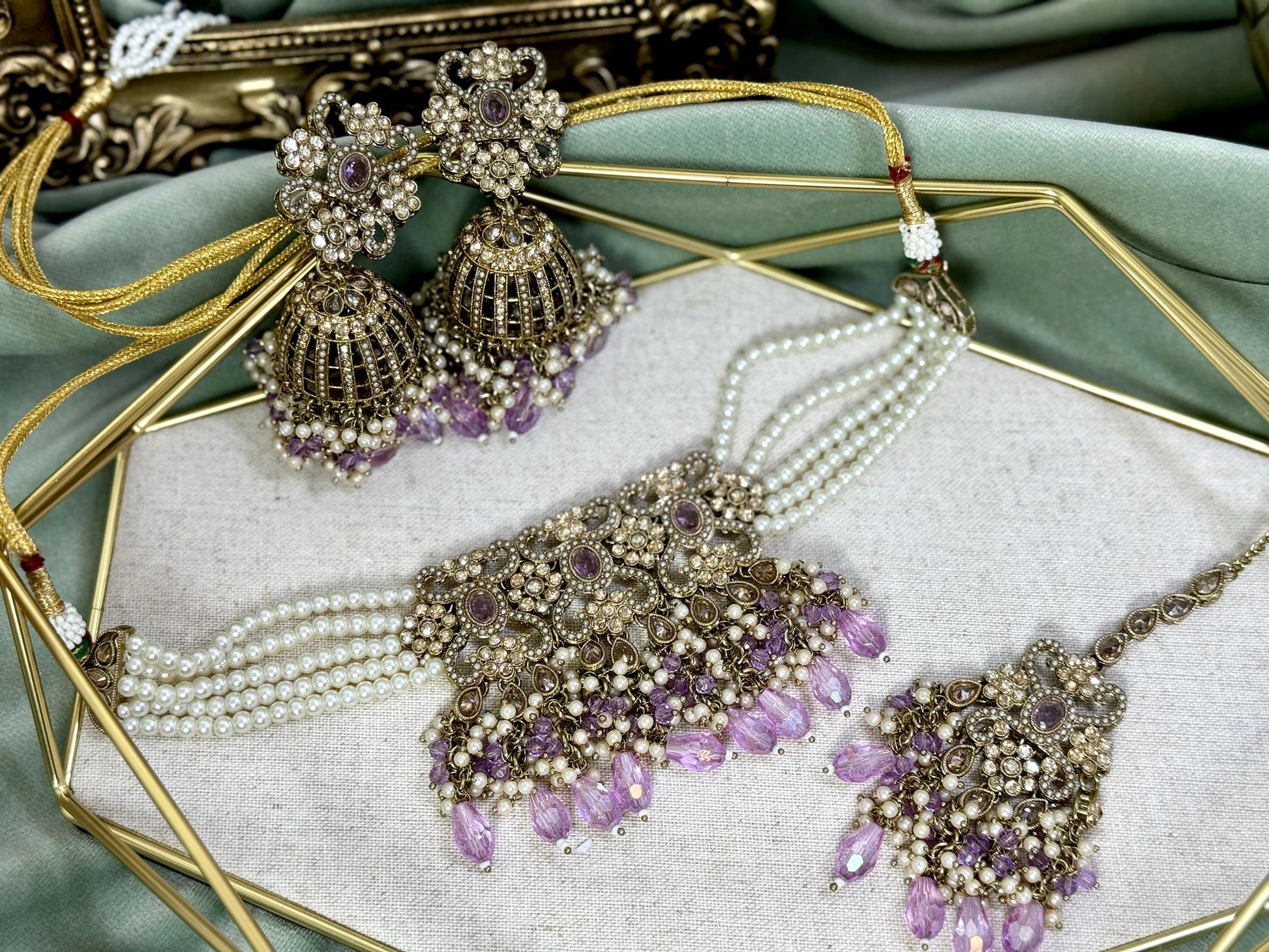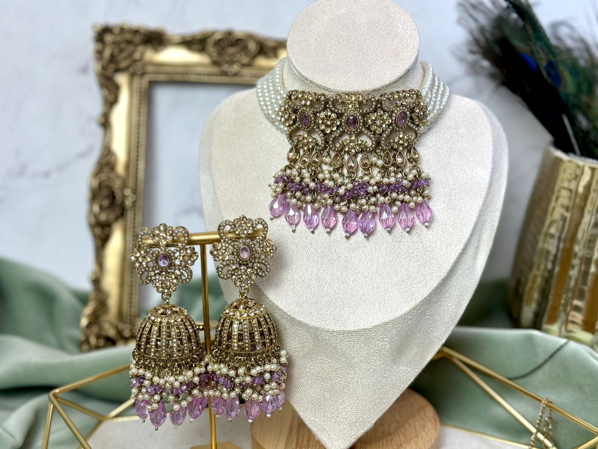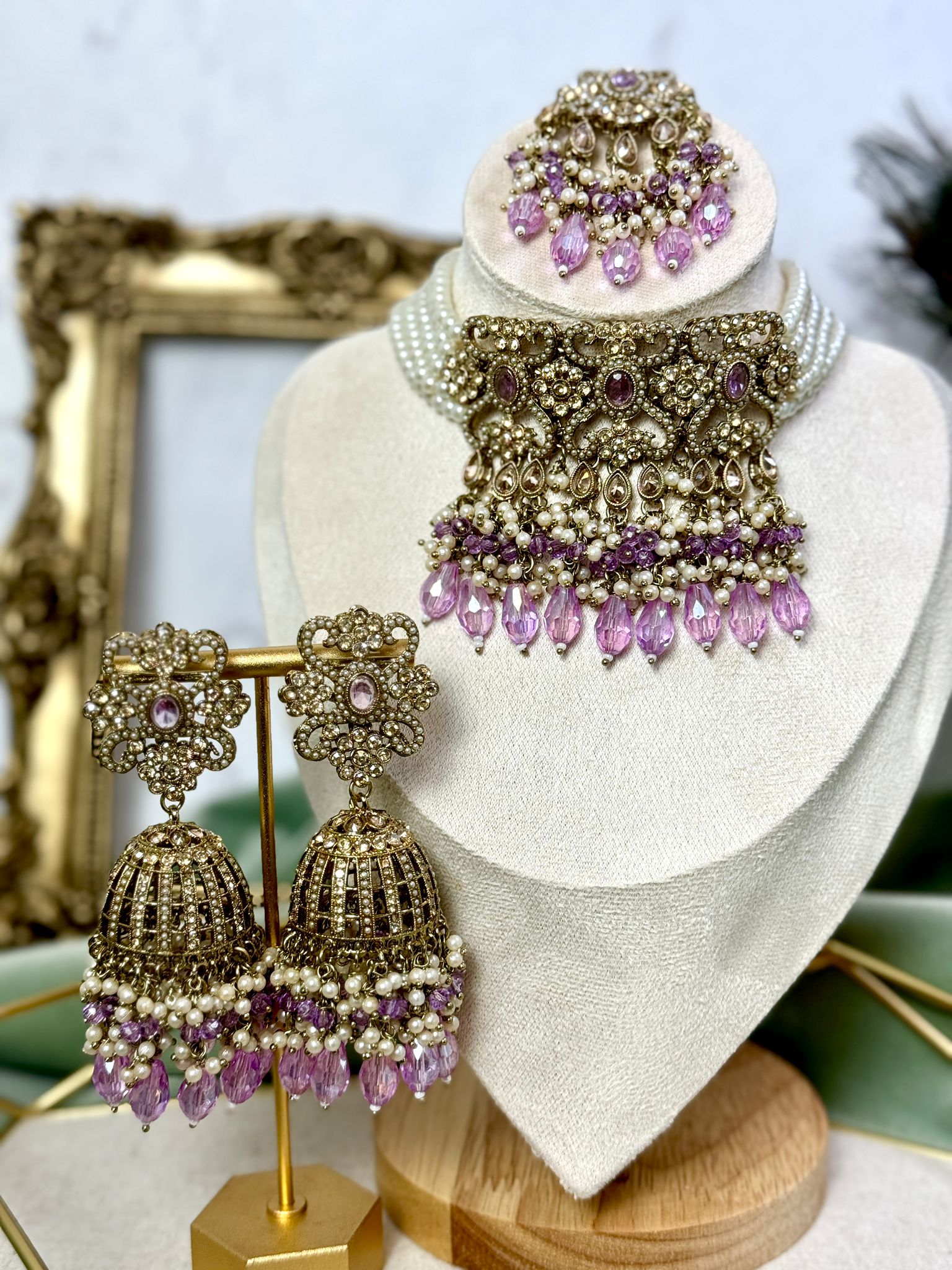 With this lavender choker, matching tikka set, and earrings, you can up your look. The product itself will be exactly as seen in the picture. Lights used for photography may cause a small amount of colour variance. Ideal for both personal use and gifting, pair it with a dress that matches to steal the show at any event.