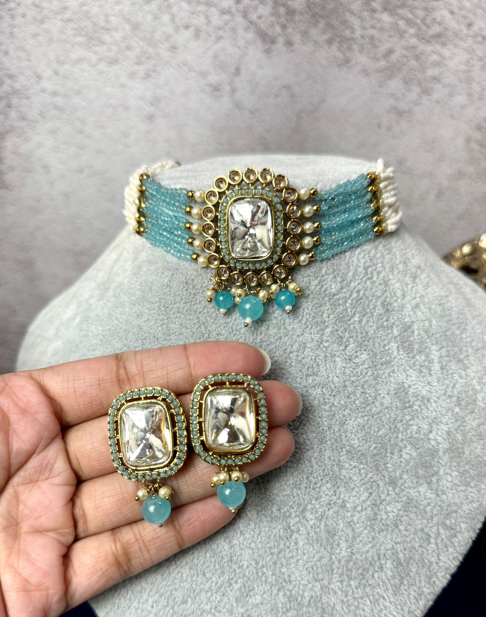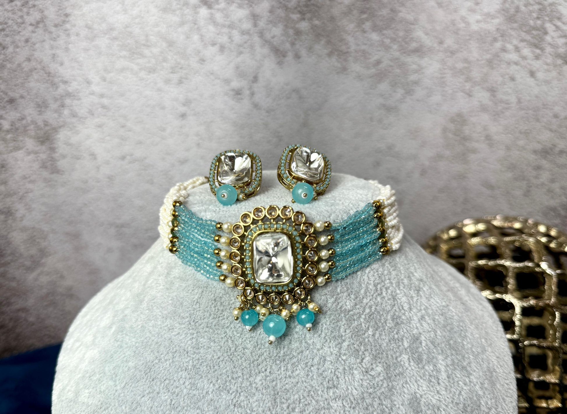 Adorn your style with a light blue polki choker paired with matching earrings. The choker is flexible, fitting any size perfectly and adding a touch of sophistication to any outfit.