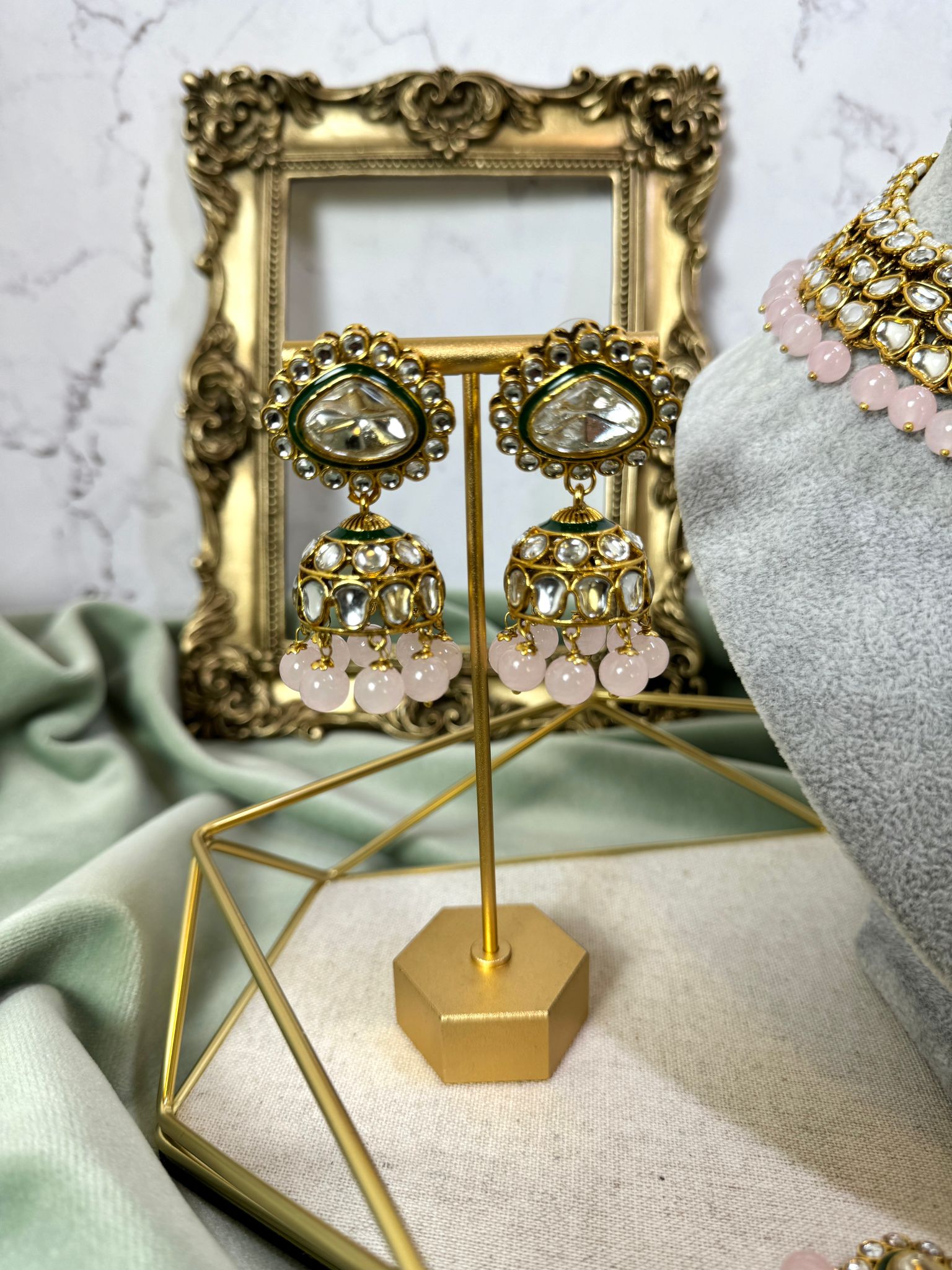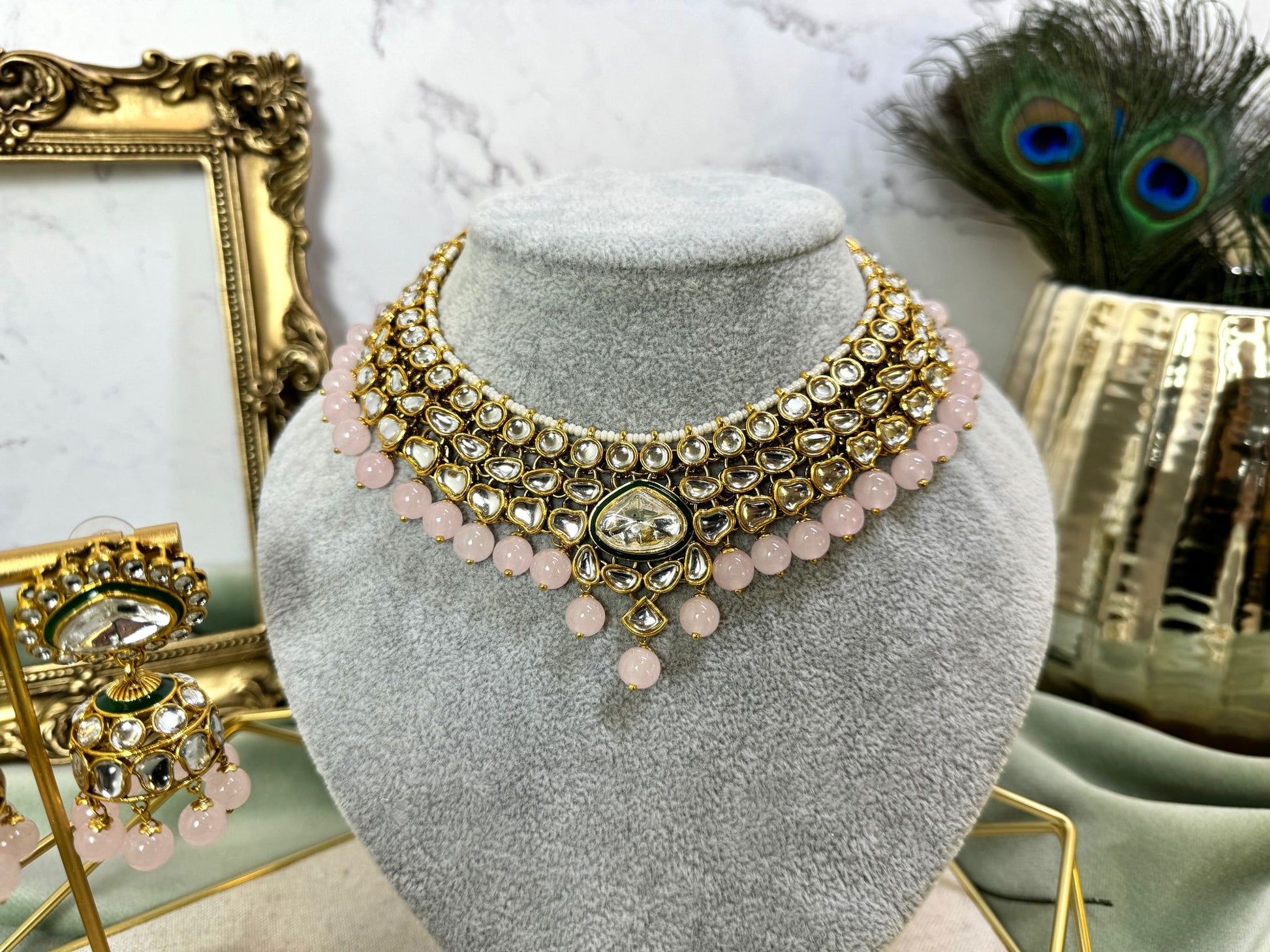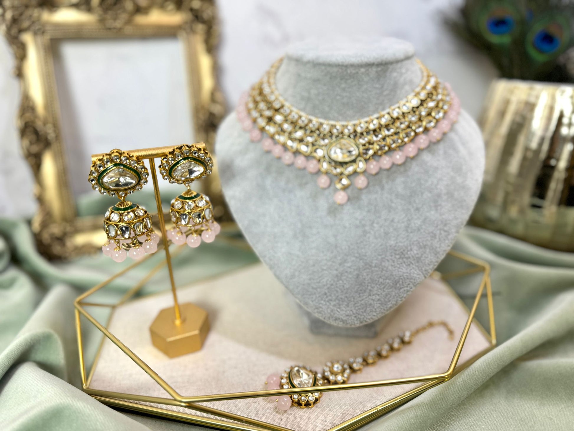 This light pink Choker Set, paired with earrings and maangtikka, is the perfect accessory for a beautiful and elegant look. With its delicate craftsmanship in Kundan stones, its classic designs will add timeless sparkle to any outfit.