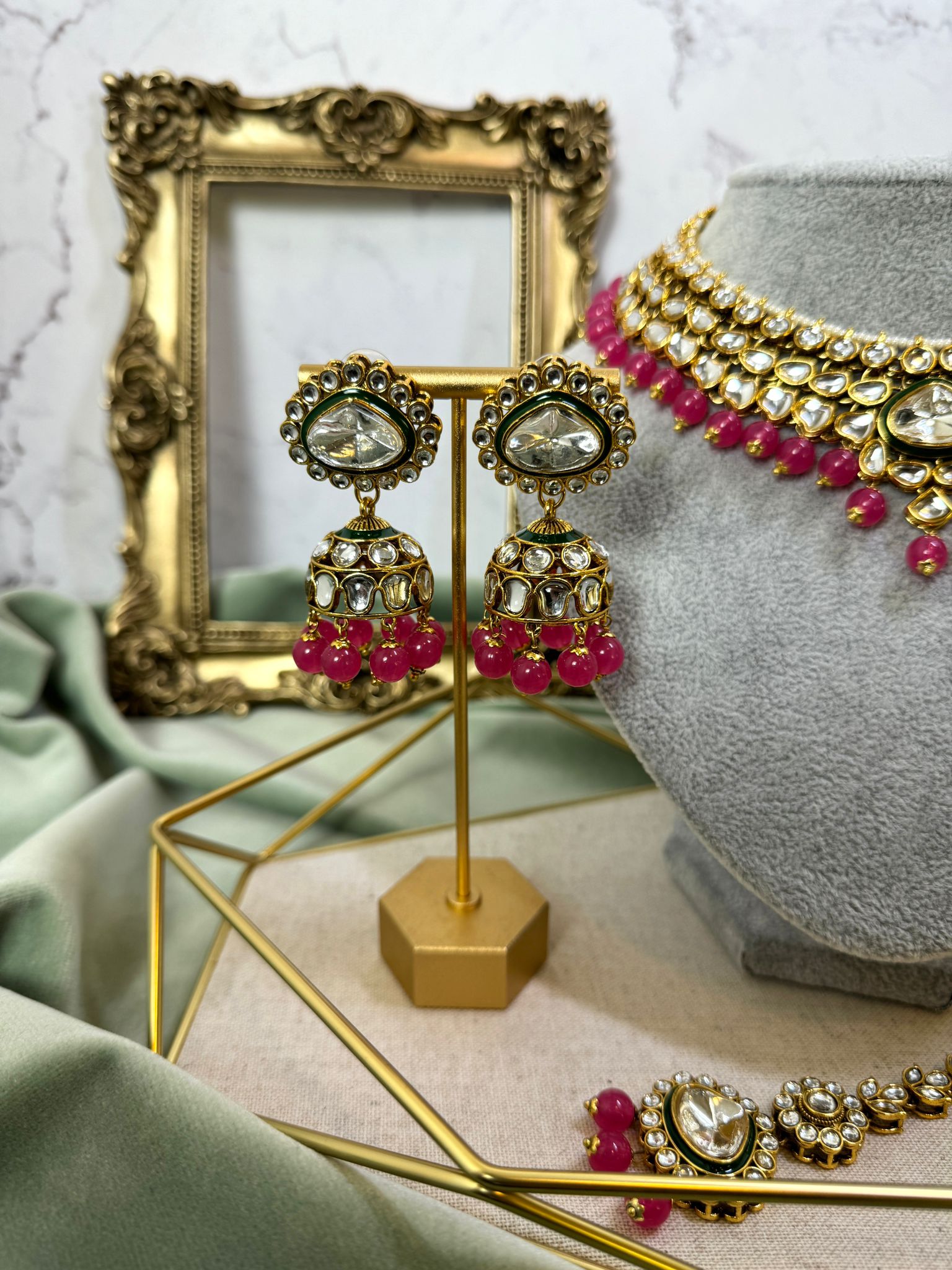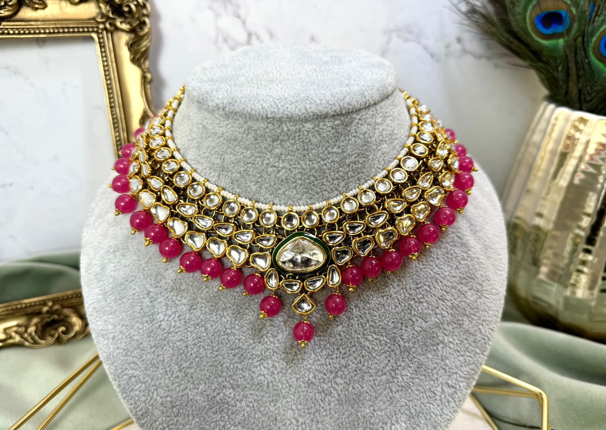 This Magenta Kundan Choker Necklace Set, complete with a pair of earrings and maangtikka, is the perfect accessory for a beautiful and elegant look. With delicate craftsmanship in Kundan stones, its classic design will add timeless sparkle to any outfit.
