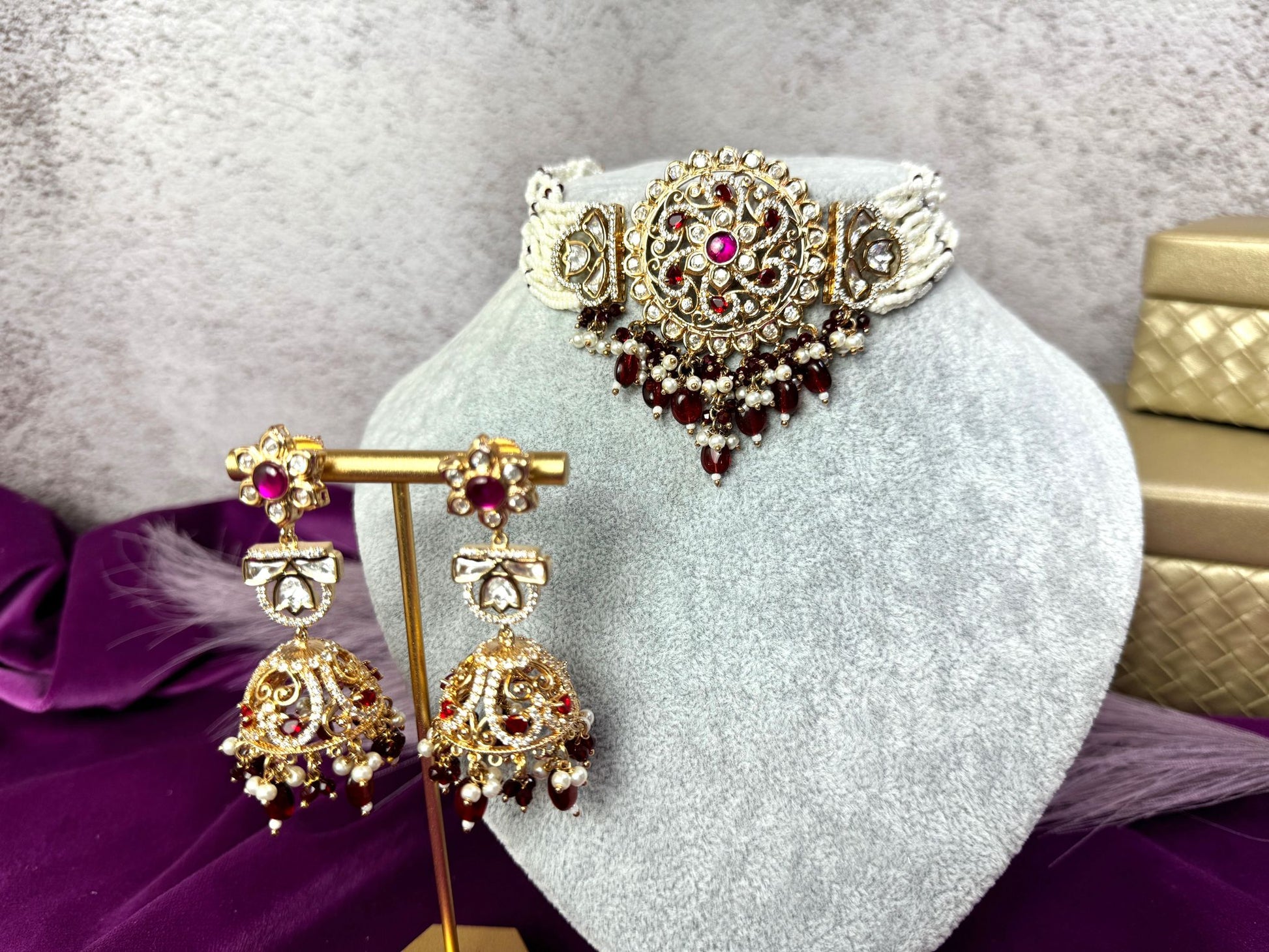Our Maroon Kundan Set will help you look graceful and attractive. The necklace and matching earrings in this gorgeous set radiate classic elegance. The intricate design of the maroon-hued Kundan craftsmanship will enhance your appearance.