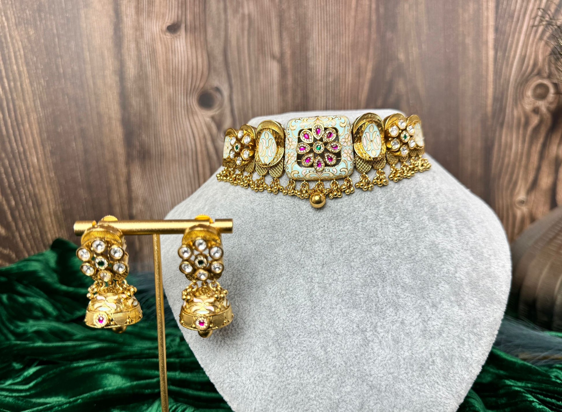 Elevate your style with our meenakari magenta set with matching earrings. Perfect for adding a touch of sophistication to any special occasion or celebration.