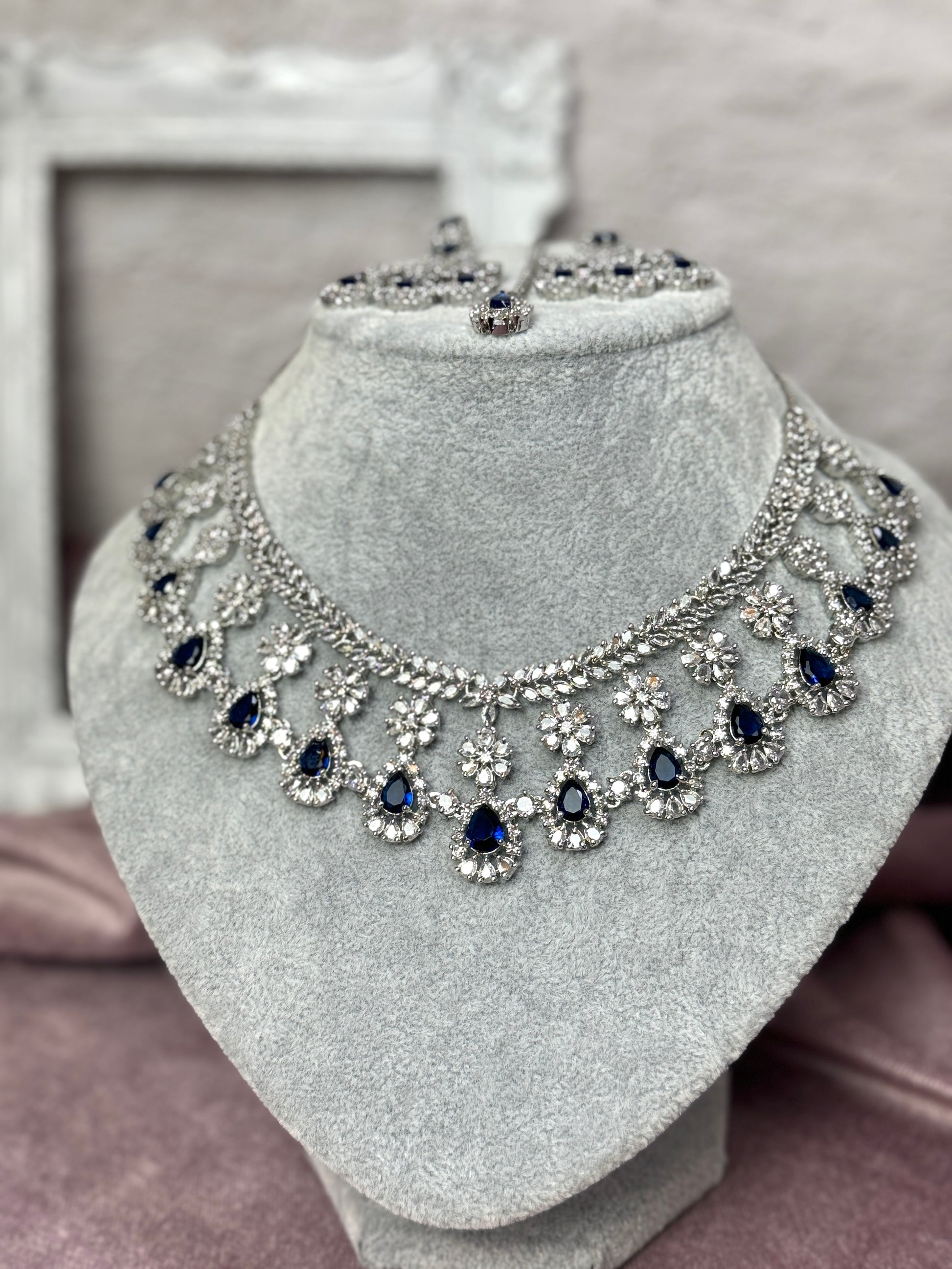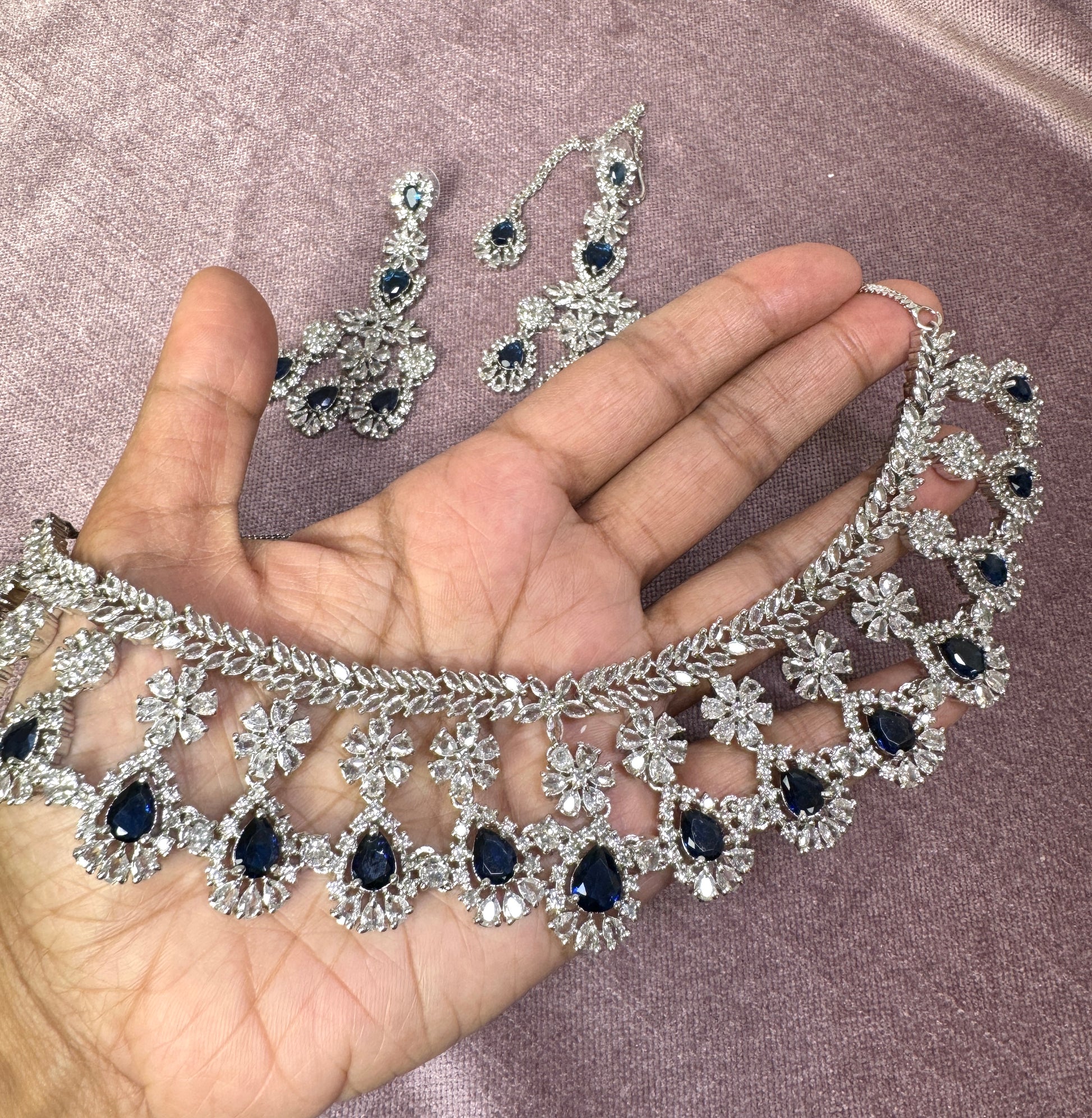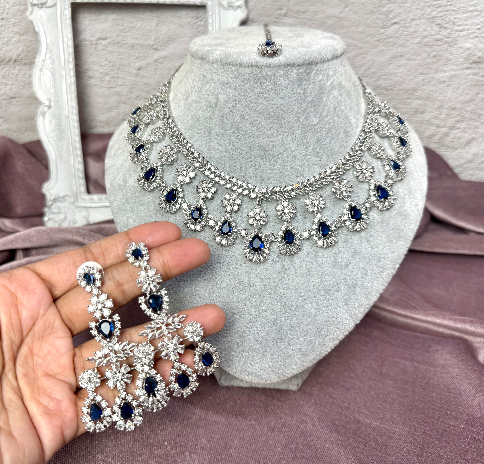 Navy Blue and Silver American Diamond Set with matching earrings and tikka. Double layer Set