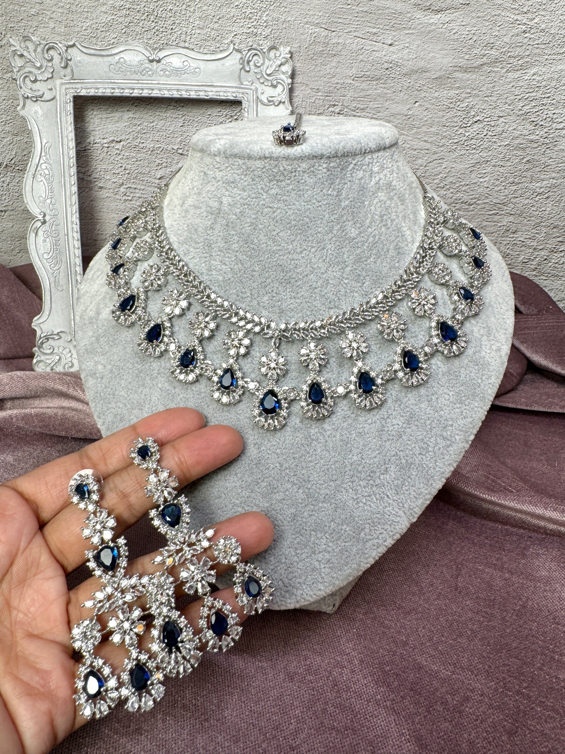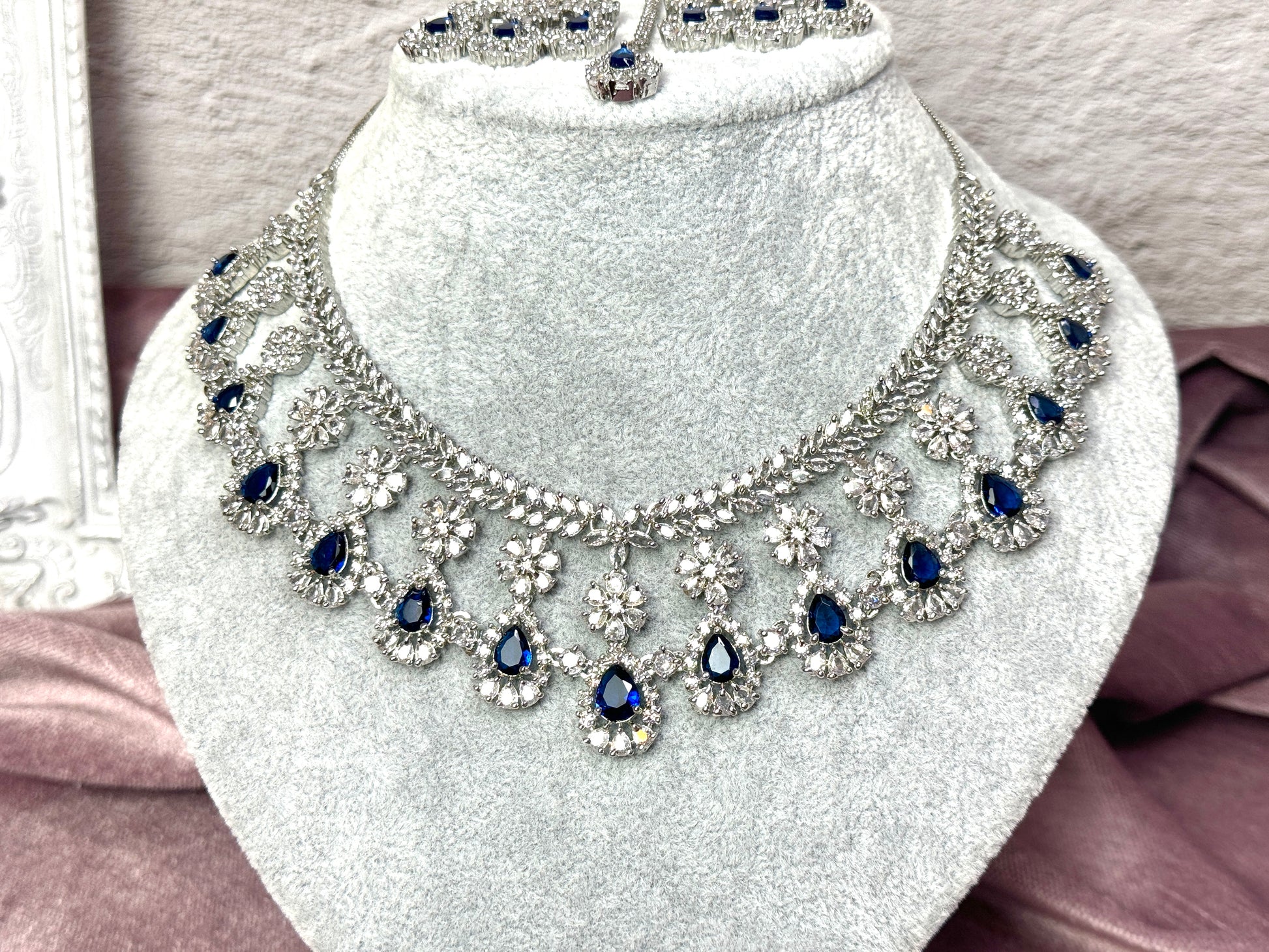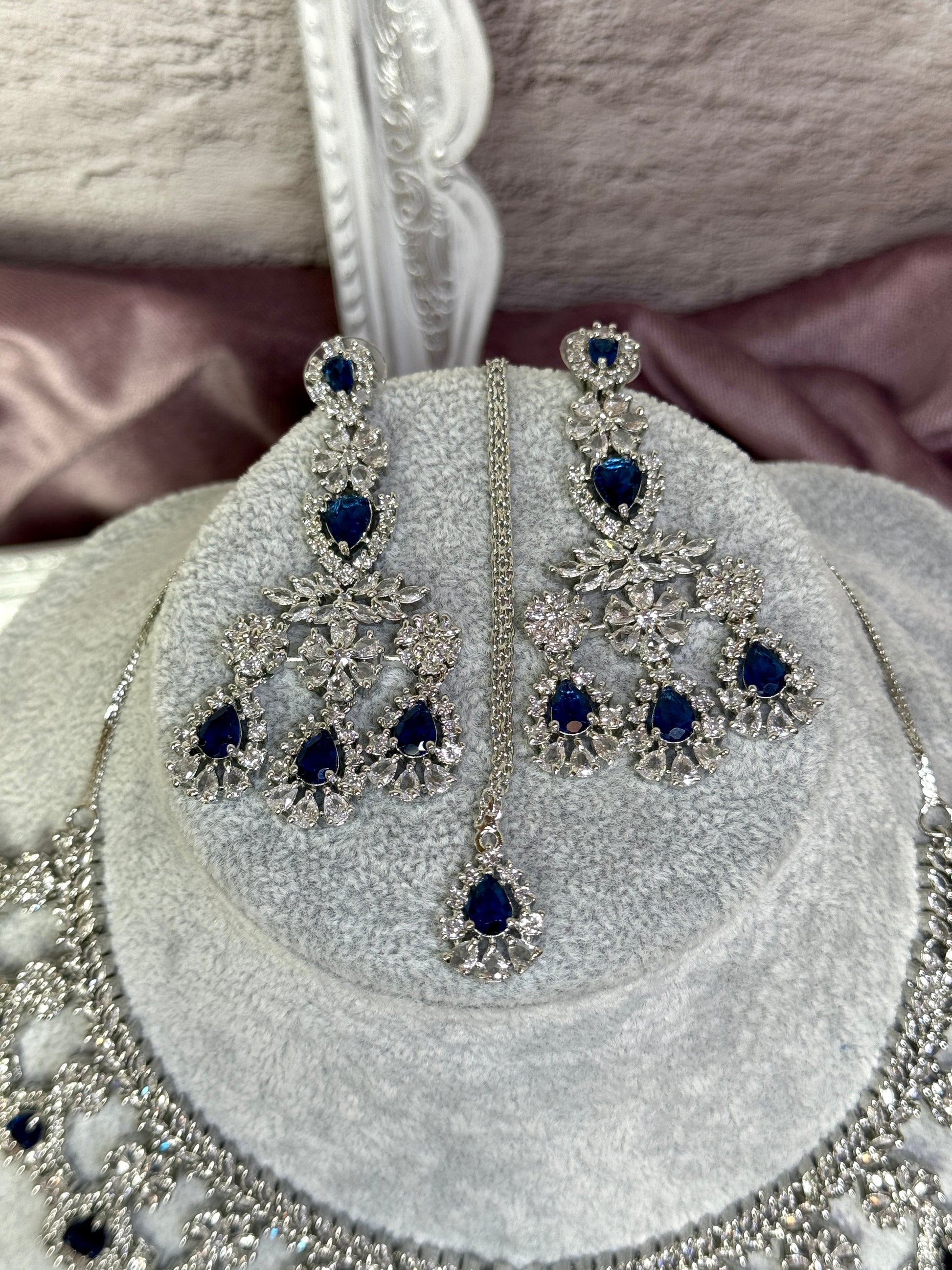 Navy Blue and Silver American Diamond Set with matching earrings and tikka. Double layer Set