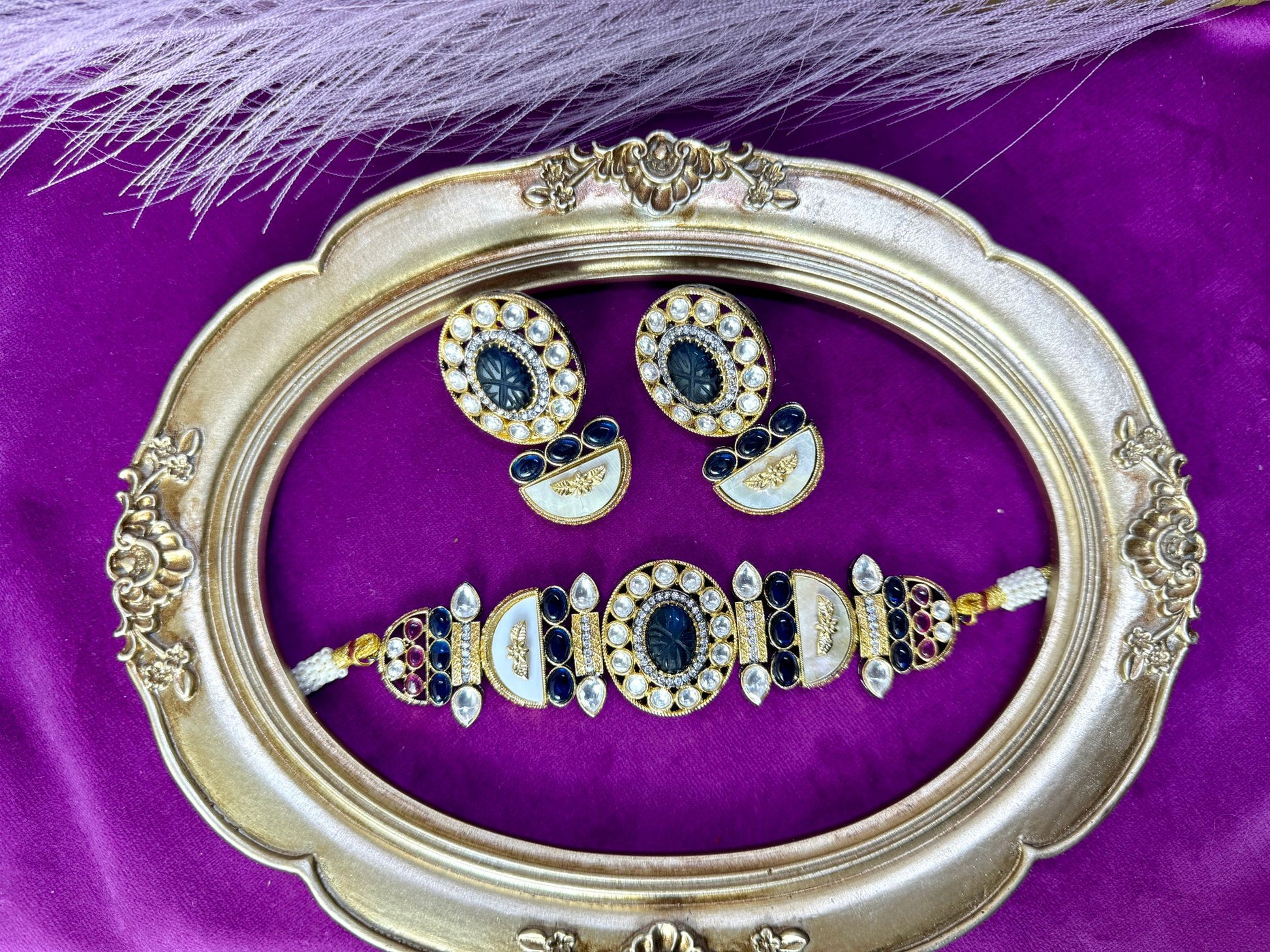 Elevate your elegance with our Navy Blue Multicolor Victorian Set with matching earrings. This gorgeous combo gives a sophisticated touch to any ensemble with its tasteful combination of navy blue and multicoloured accents
