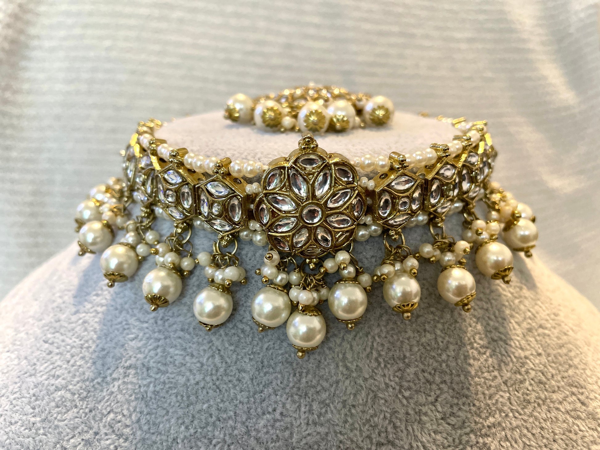 Pearl kundan choker set with sahara jhumkas and matching tikka