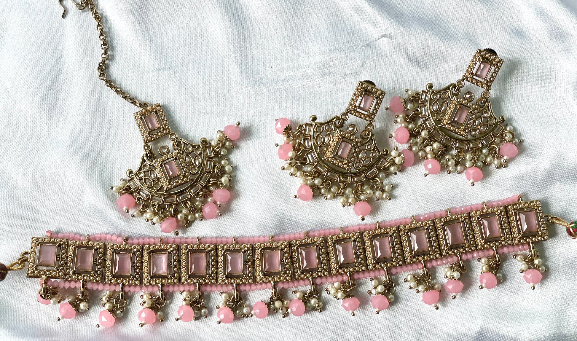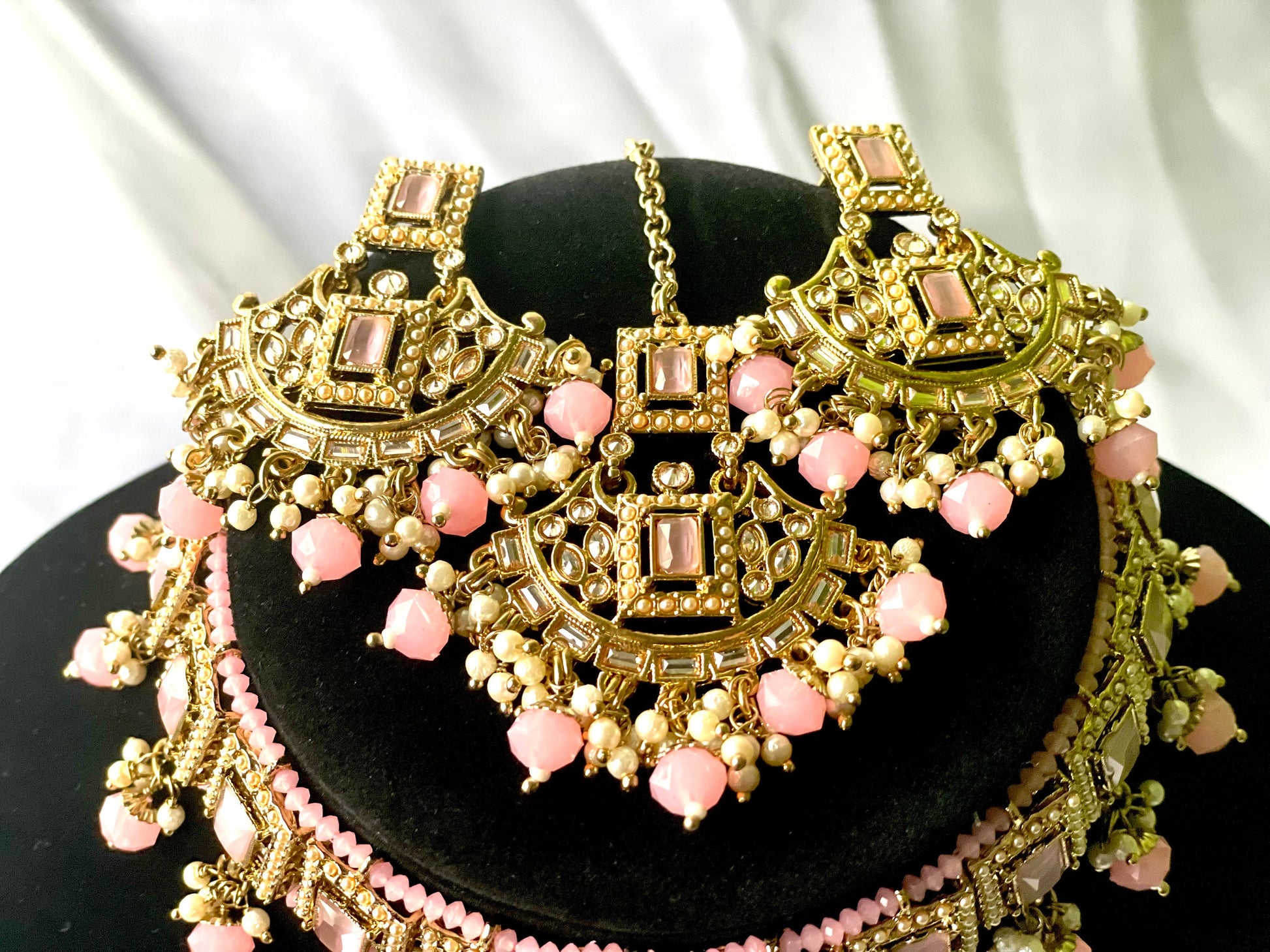 Gorgeous bridal or semi bridal set. Trendy gold, polki and pearl. Comes with adjustable choker , earrings, tikka.