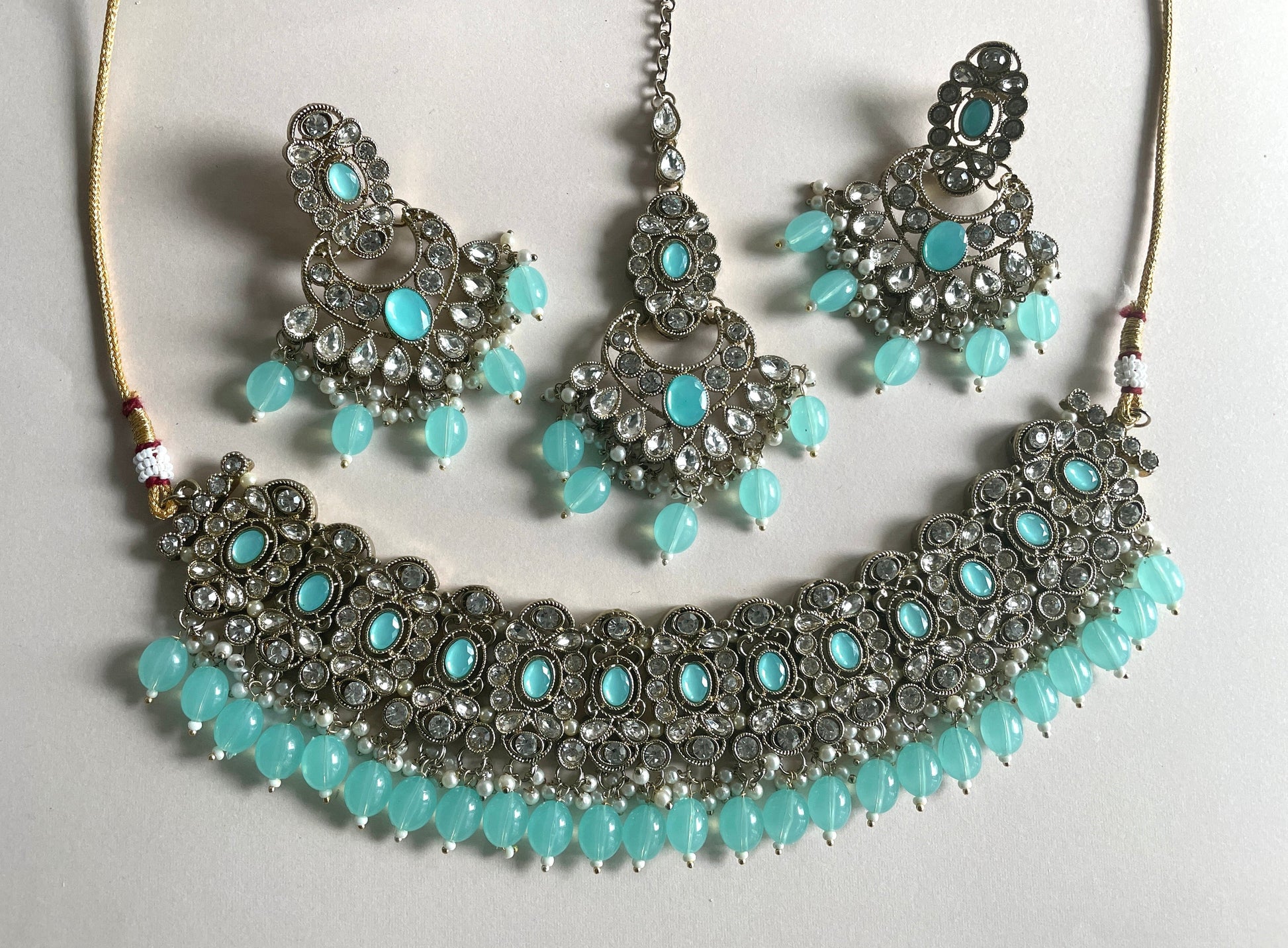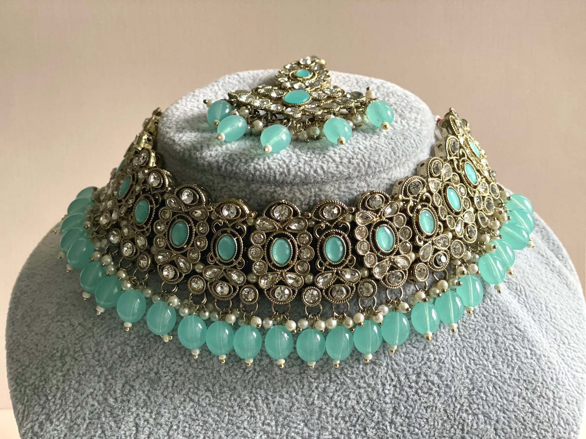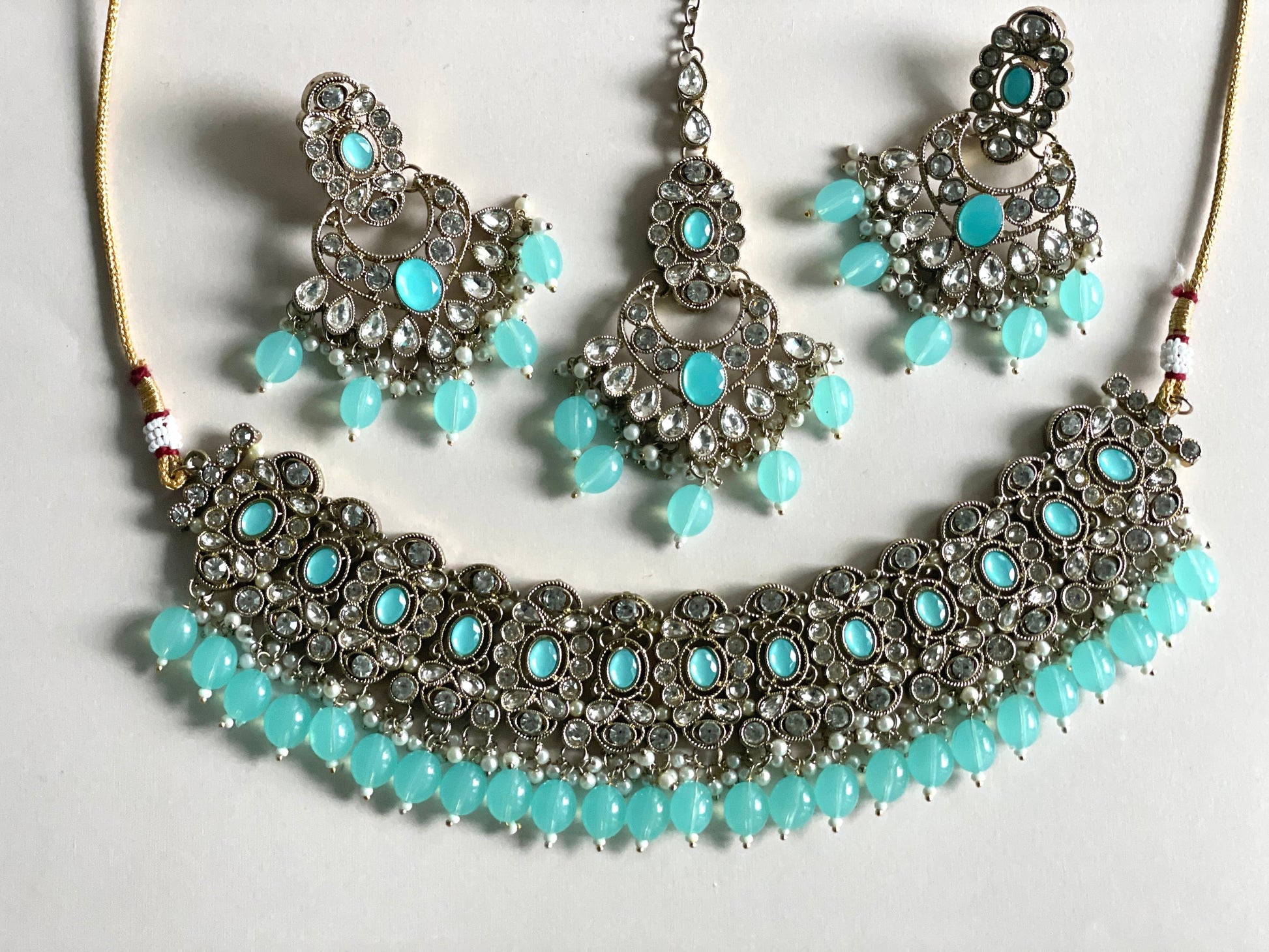 This luxury set is made out of baby blue beads and gold plated trim. It comes with matching blue earrings and blue tikka. It is such a beautiful color and fancy set that can be worn with so many different outfits and indian events.