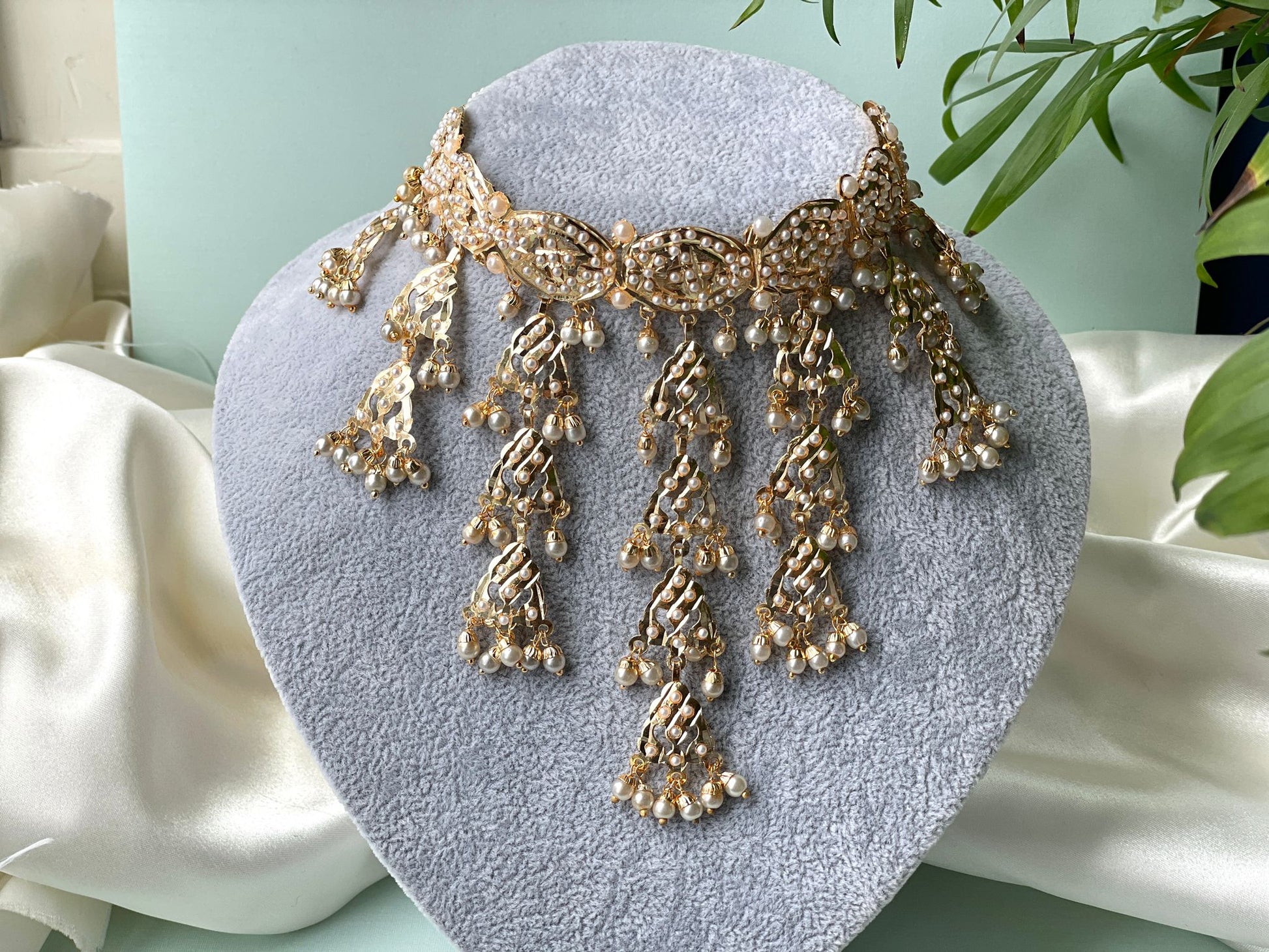 The magnificent Punjabi gold Jadau Set is an example of traditional workmanship and beauty. This set, inspired by the rich heritage of Punjab, features intricate and vibrant Jadau work that exudes regal charm.