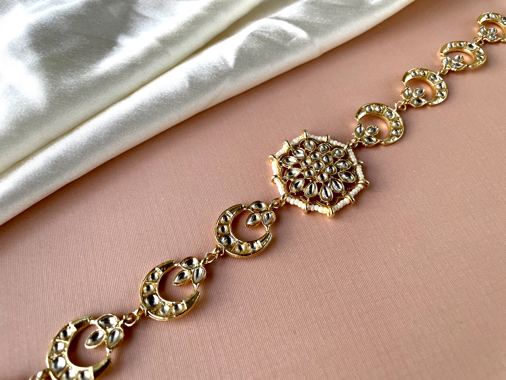 Enhance your style with the timeless charm of Rania Sheesh Phool, a delicate fusion of elegance and tradition. Adorned with beautiful crystal petals, this accessory gives a touch of regal majesty to any attire.