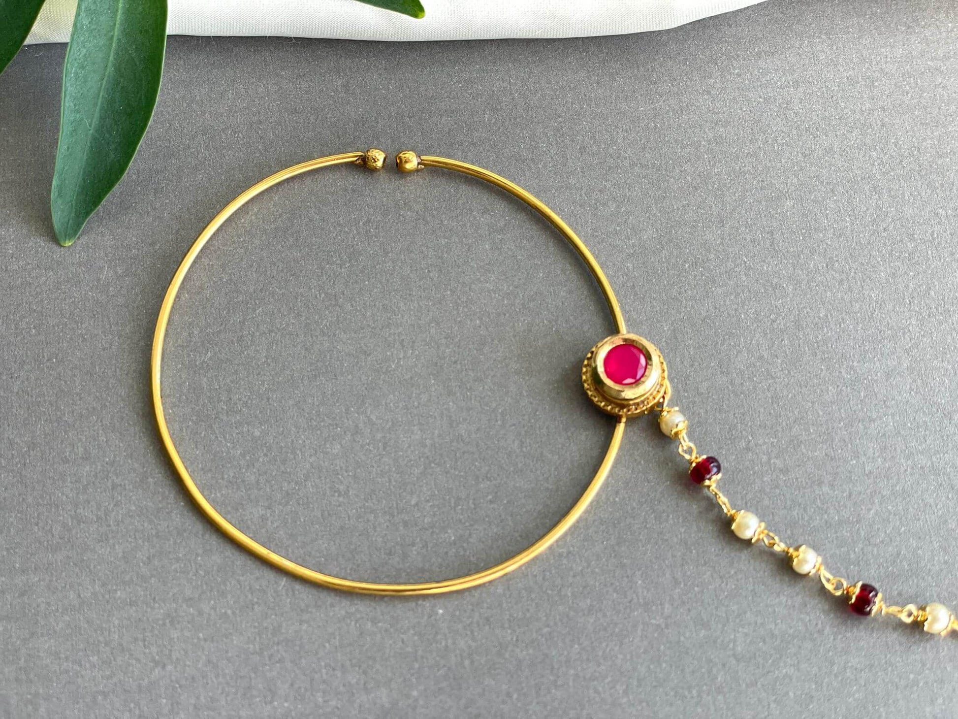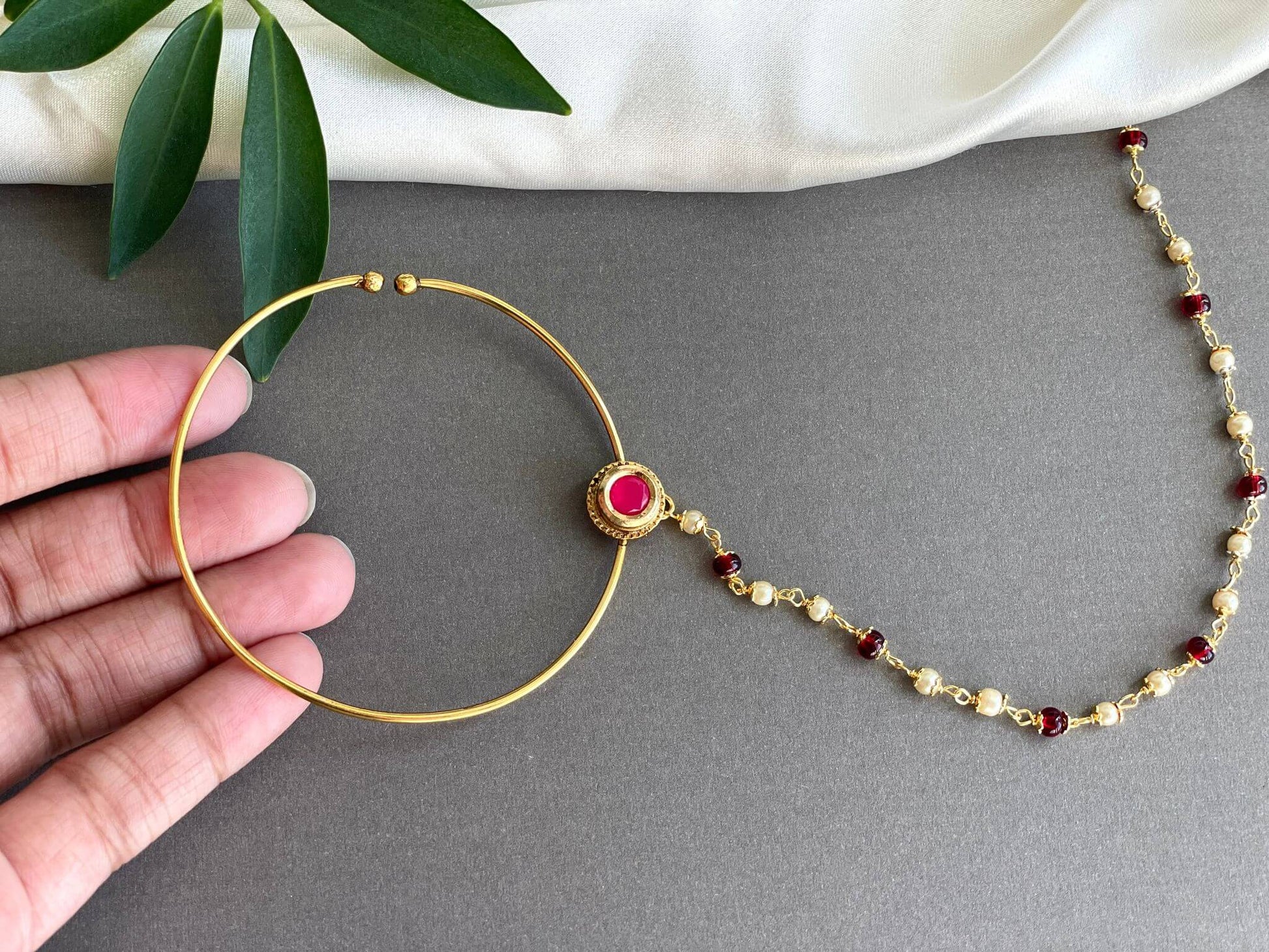 This gorgeous nose ring is a stunning accessory that elegantly adorns your nose by adding the bright attractiveness of gold with the timelessness of deep red gemstones. This eye-catching red and gold nose ring elevates your sense of style while enhancing your natural beauty.