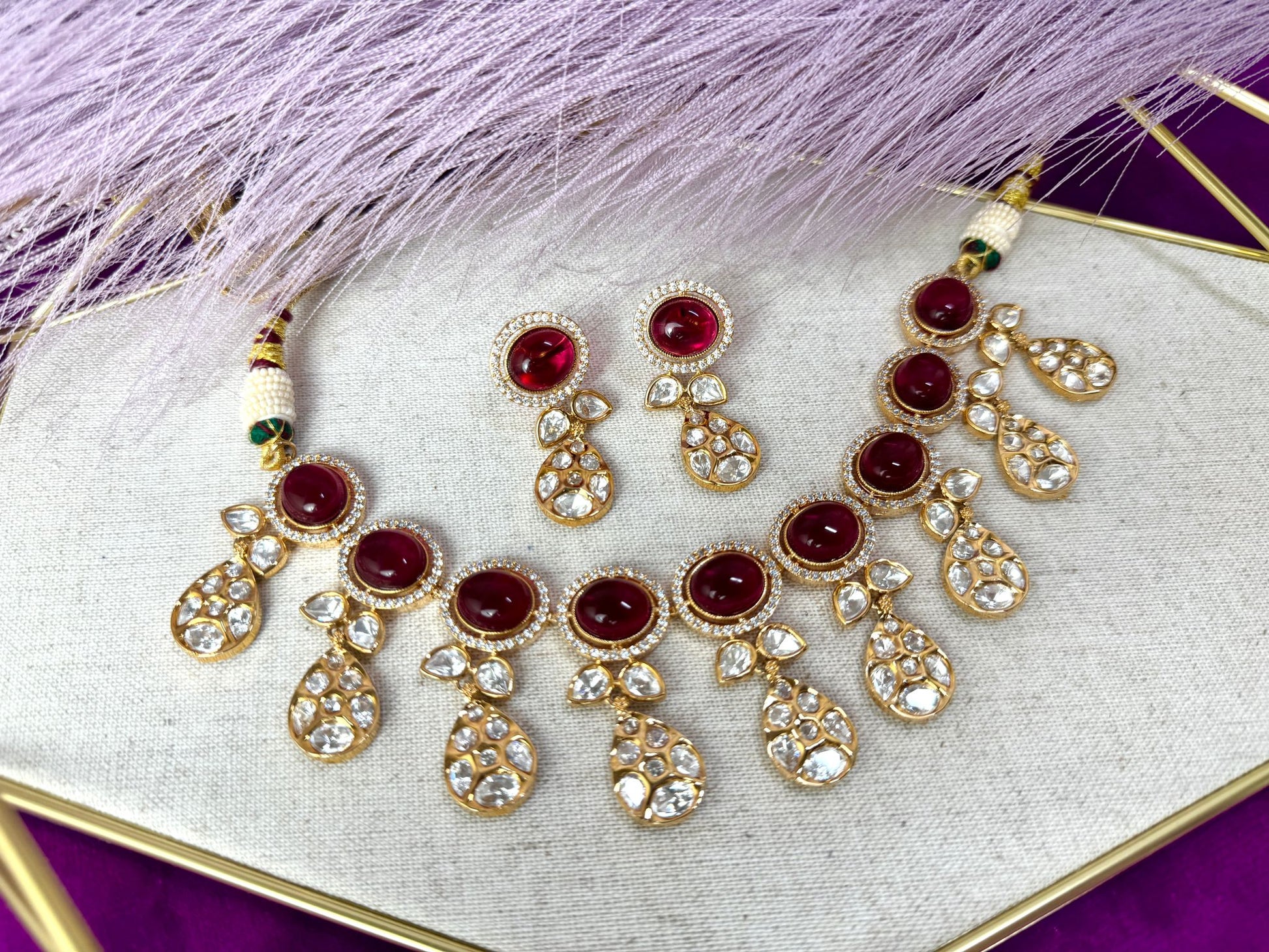 Elevate your style with our red gold tyaani choker with matching earrings. Embrace the allure of timeless beauty and make a bold statement at any occasion with this stunning red gold tyaani choker.