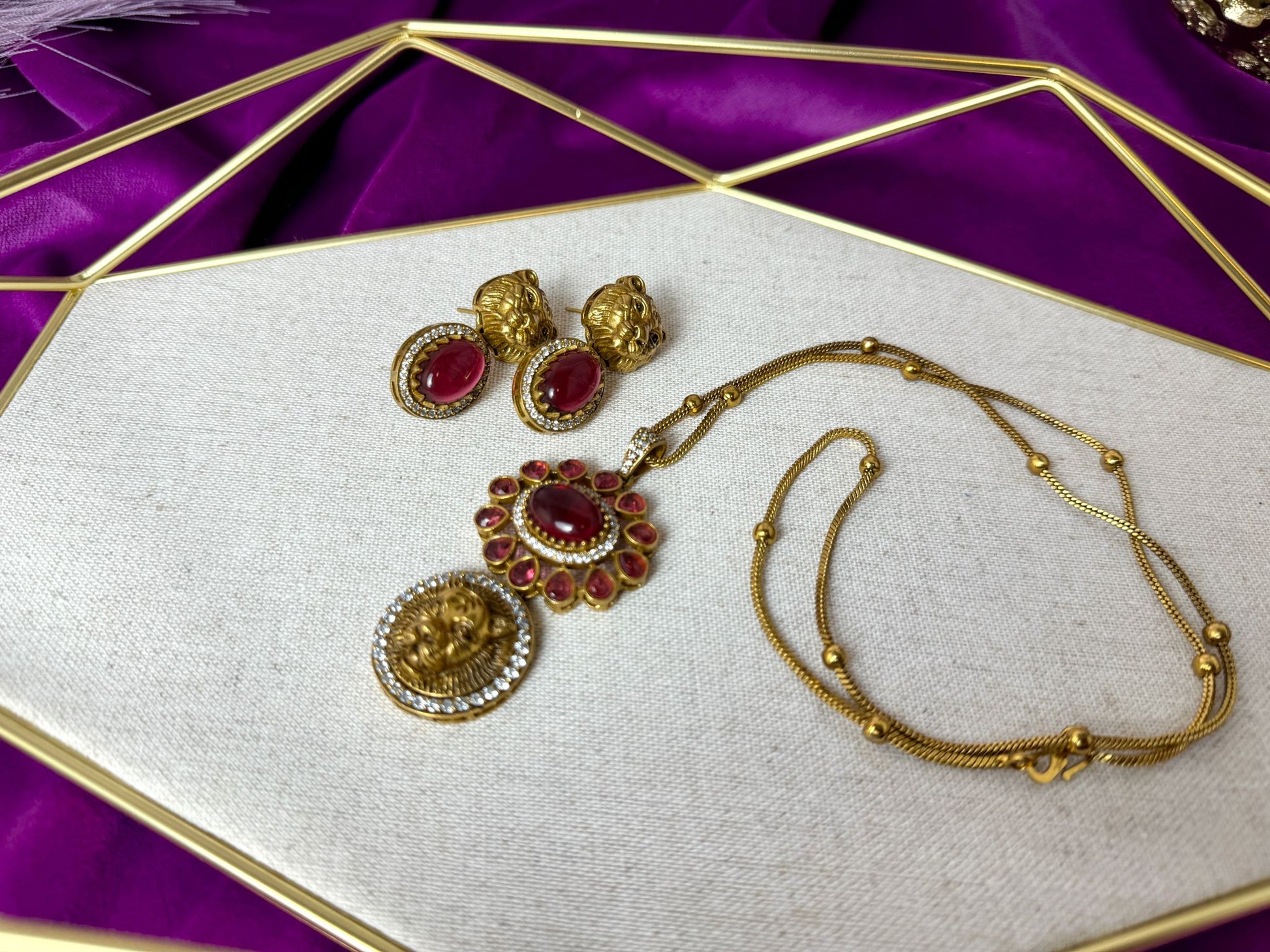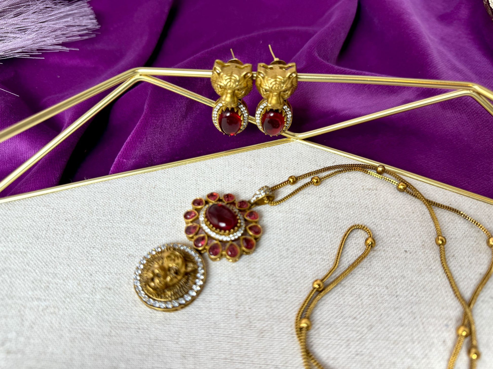 Elevate your style with our red lion chain pendant with pair of stylish earrings. A unique design and best gift for your partner.