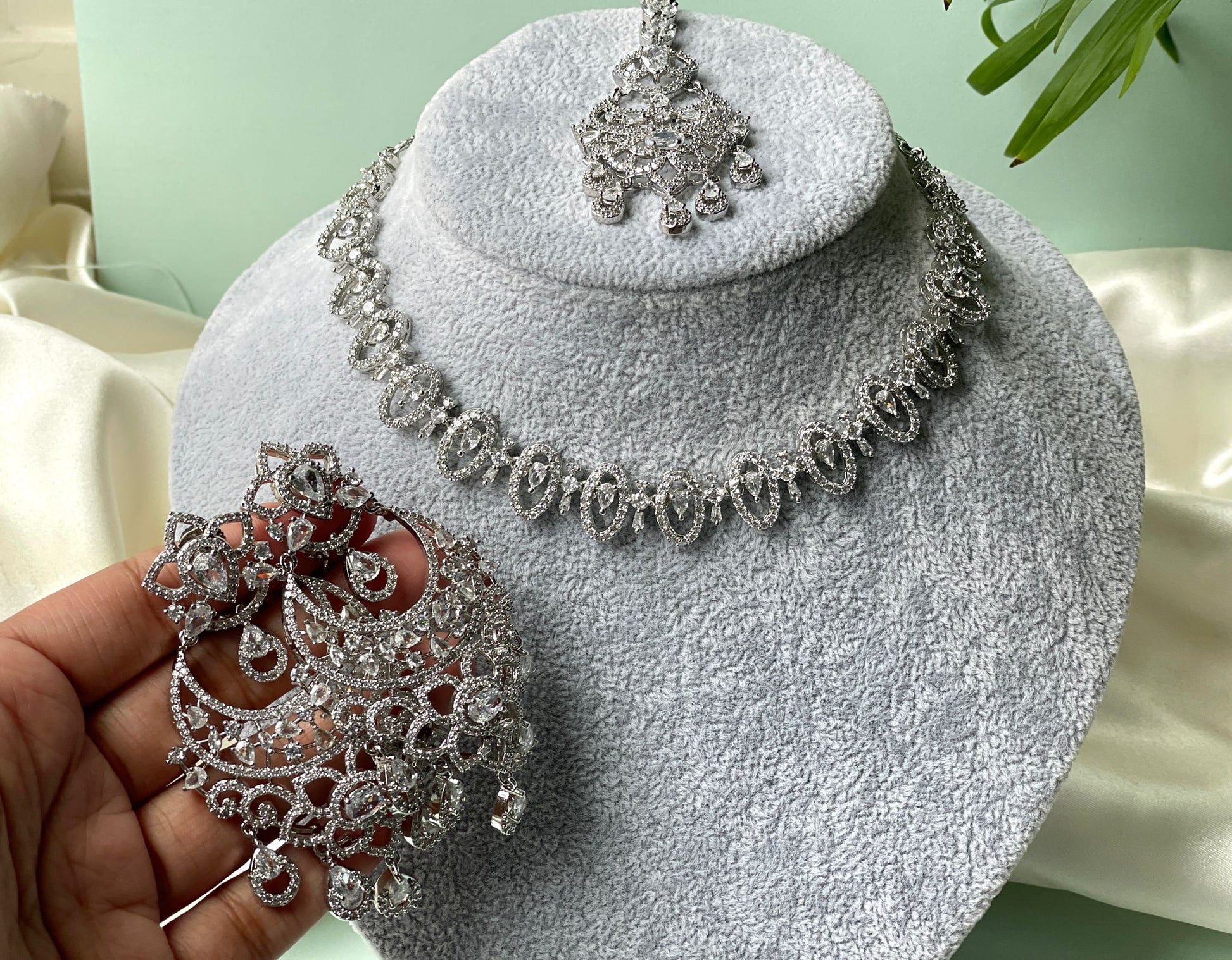 The beautiful Silver set is AD Crystals. The necklace symbolises positivity and happiness. Make a statement with our stunning Silver Necklace, a versatile accessory that complements your every look, from casual to formal.