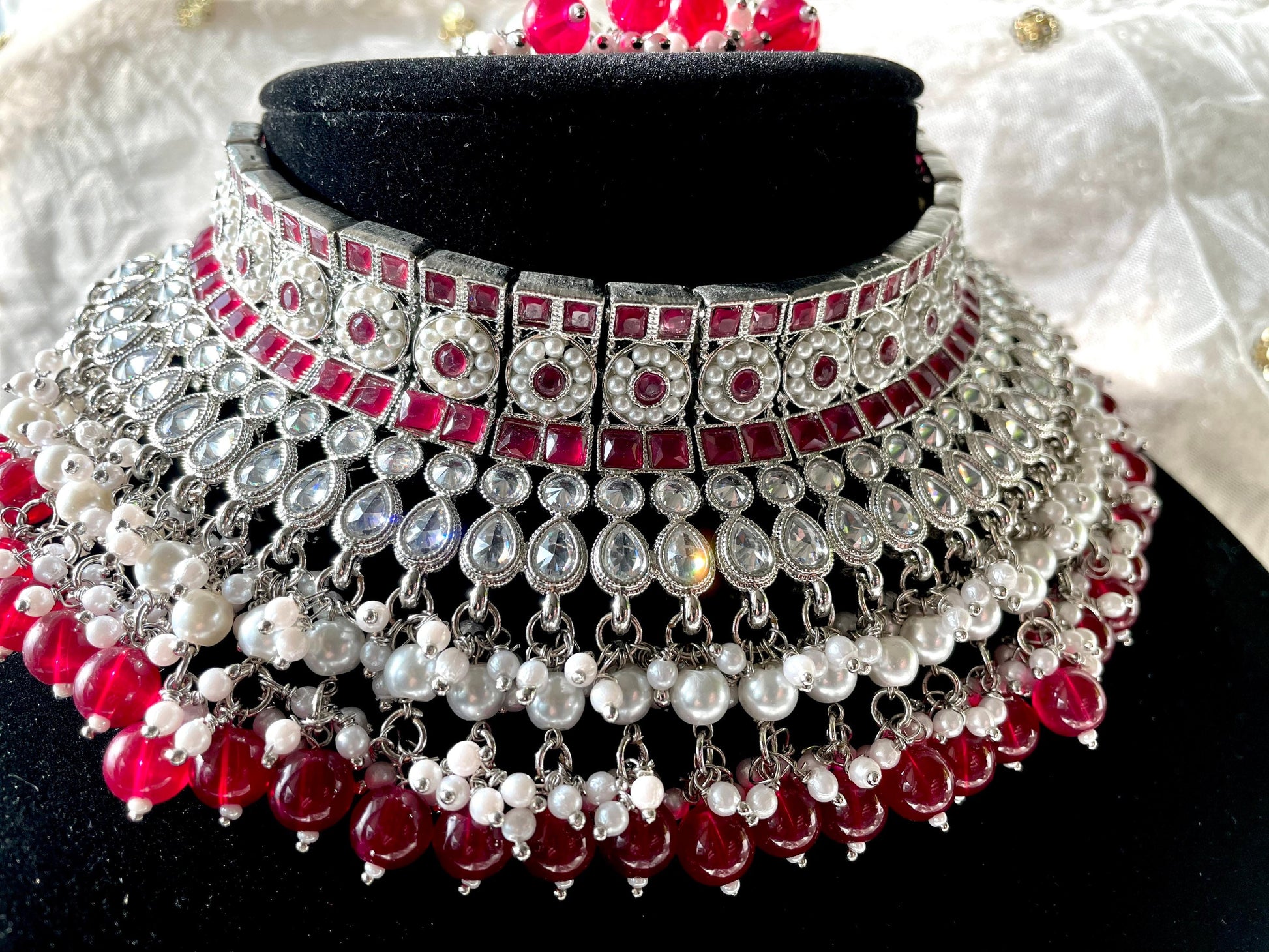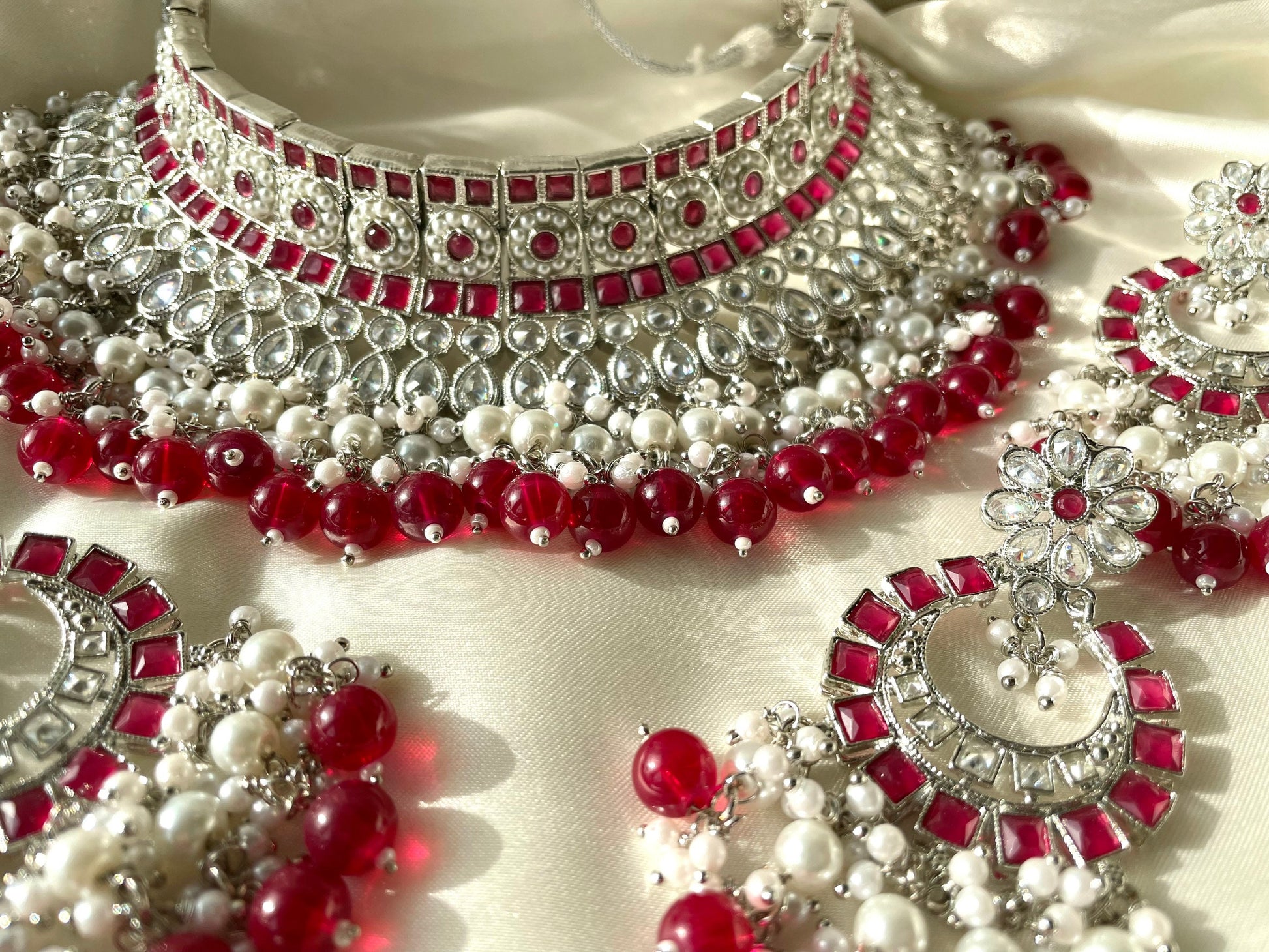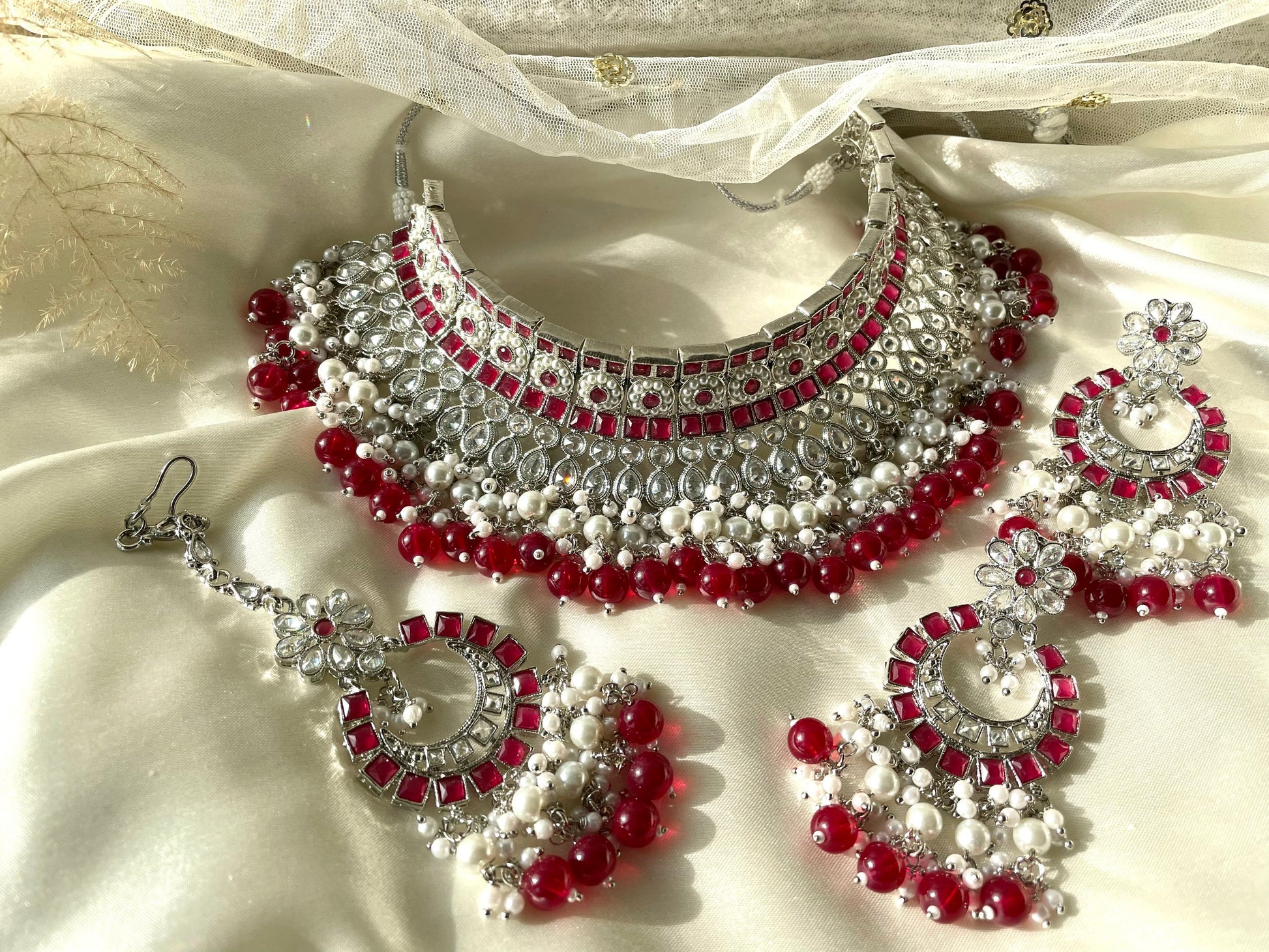 The Silver and Red Polki Set will exude beauty and class. This set is ideal for special occasions due to its dramatic contrast of silver and red polki stones, which oozes everlasting attractiveness. Elevate your style to the next level and make a statement that stands out.