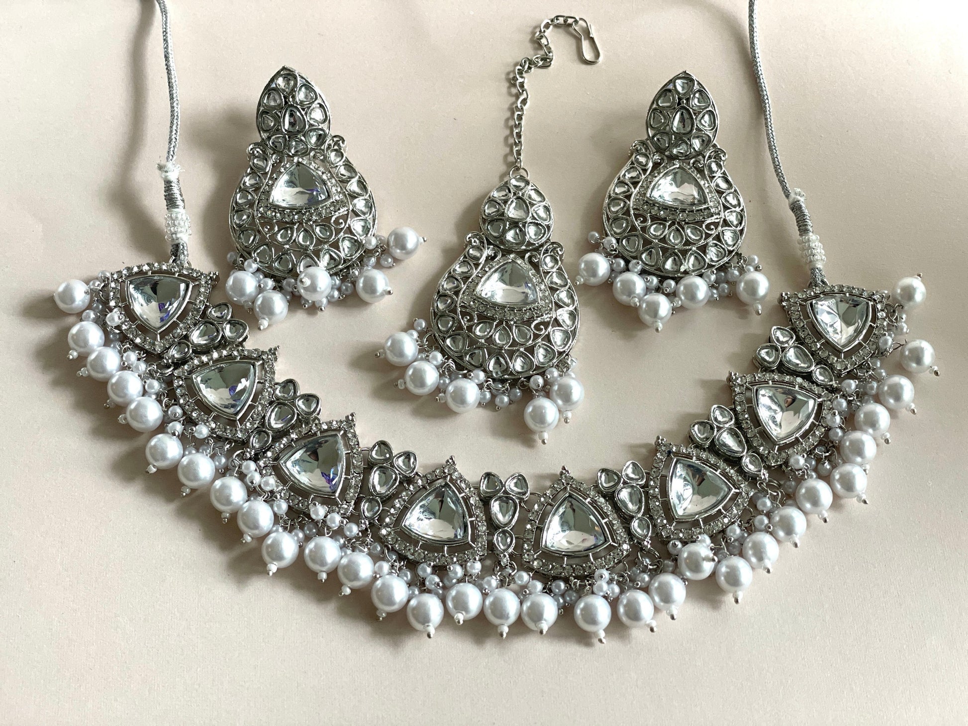 Pretty silver plated kundan necklace set with matching earrings and tikka. This set may look heavy but is super light weight to wear. This set is so luxurious to wear to any Indian occasion. It is high quality with silver kundan and pearls.