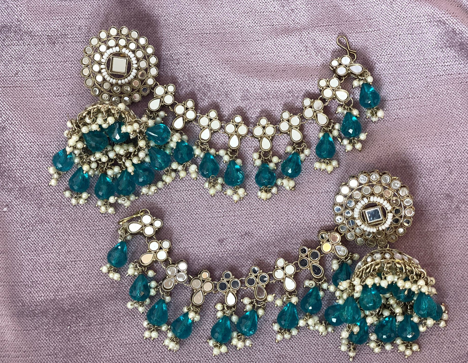Teal Mirror Sahara Jhumkas - Aura 1016