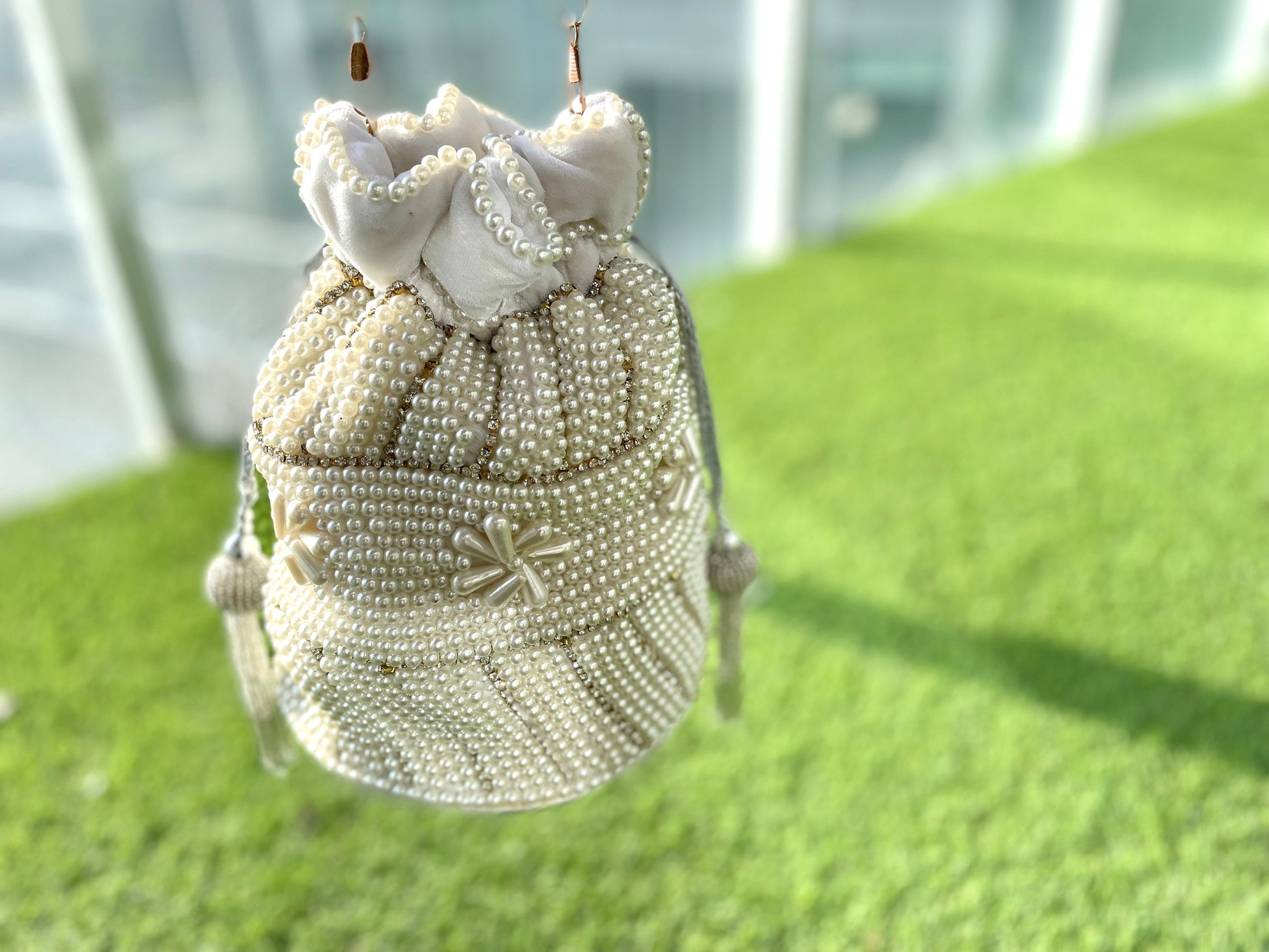 The White Pearl Potli Bag is exquisitely made and expertly combines style and heritage. It is a classic accessory for any special occasion with its beautiful white exterior encrusted with tiny pearls.