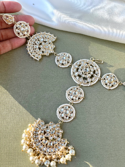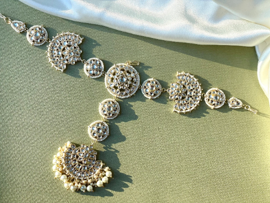Gorgeous trendy head piece with attached tikka gold And pearl.